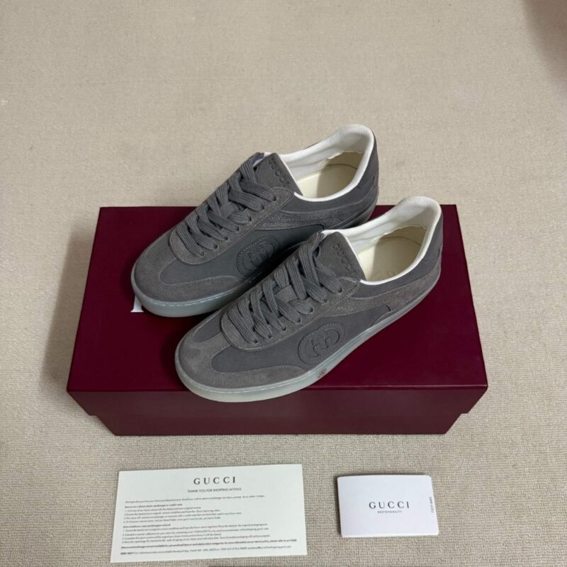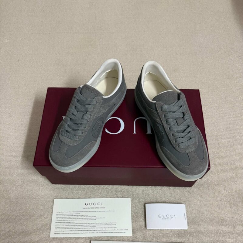 In the Fall Winter 2025 collection, inspired by retro basketball shoes from the ’70s, these sneakers are defined by signature Gucci symbols such as the Interlocking G logo. This model appears in suede and leather trim.