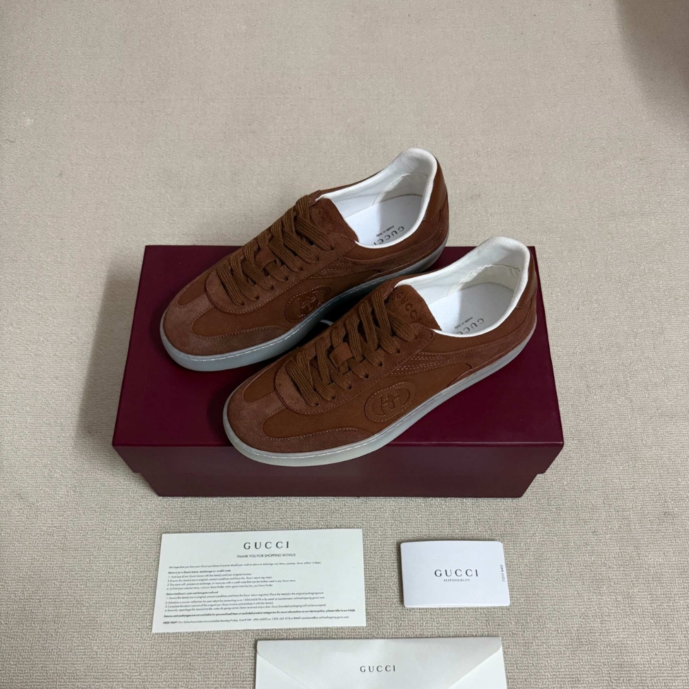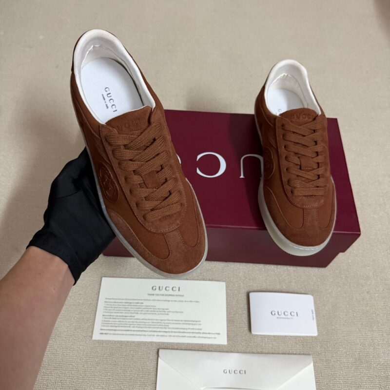 In the Fall Winter 2025 collection, inspired by retro basketball shoes from the ’70s, these sneakers are defined by signature Gucci symbols such as the Interlocking G logo. This model appears in suede and leather trim.