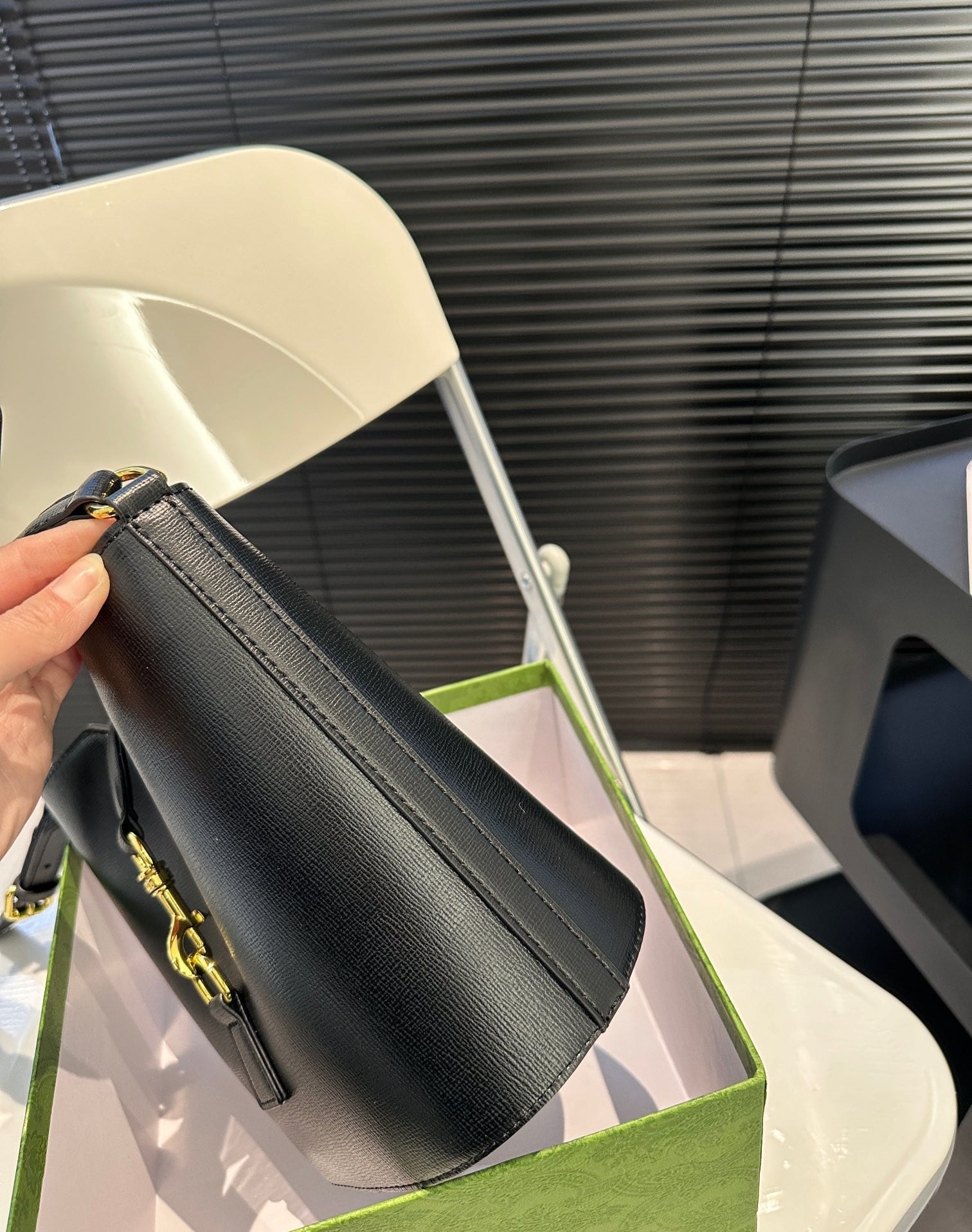 - Light gold-toned metal hardware