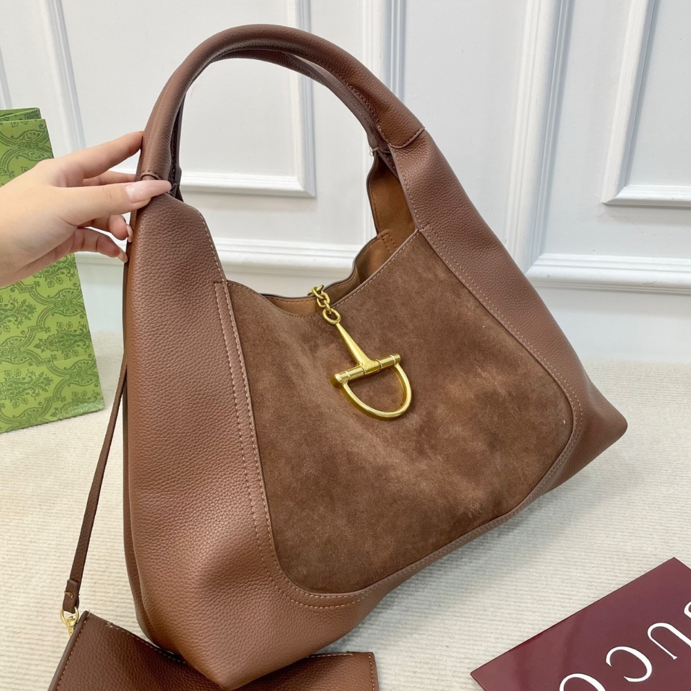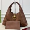 The Gucci Softbit Maxi Suede Shoulder Bag in Brown is oversized hobo bag from the Pre-Fall 2025 collection, designed by former Creative Director Sabato De Sarno. This model reimagines archival House codes with a contemporary triangular silhouette and the iconic half-horsebit hardware.