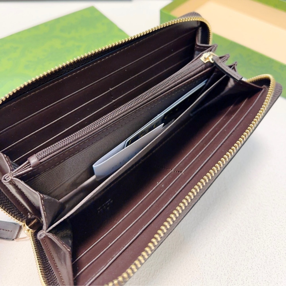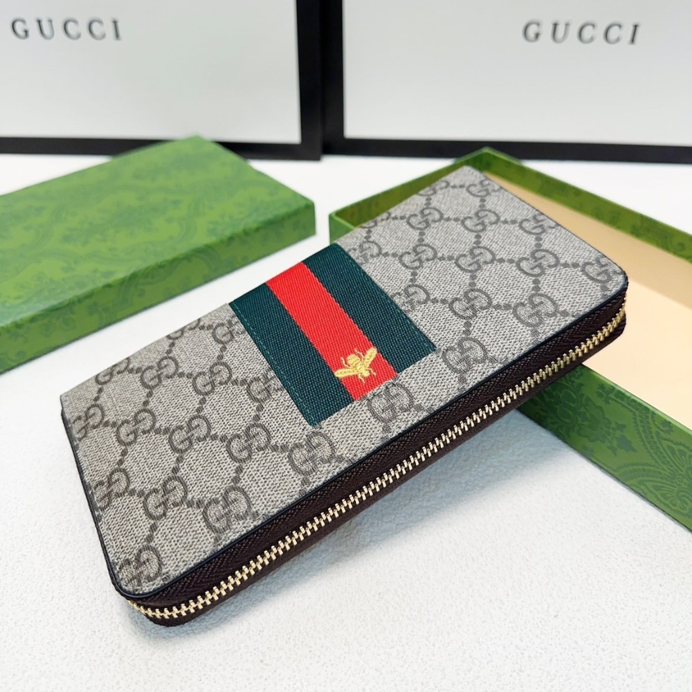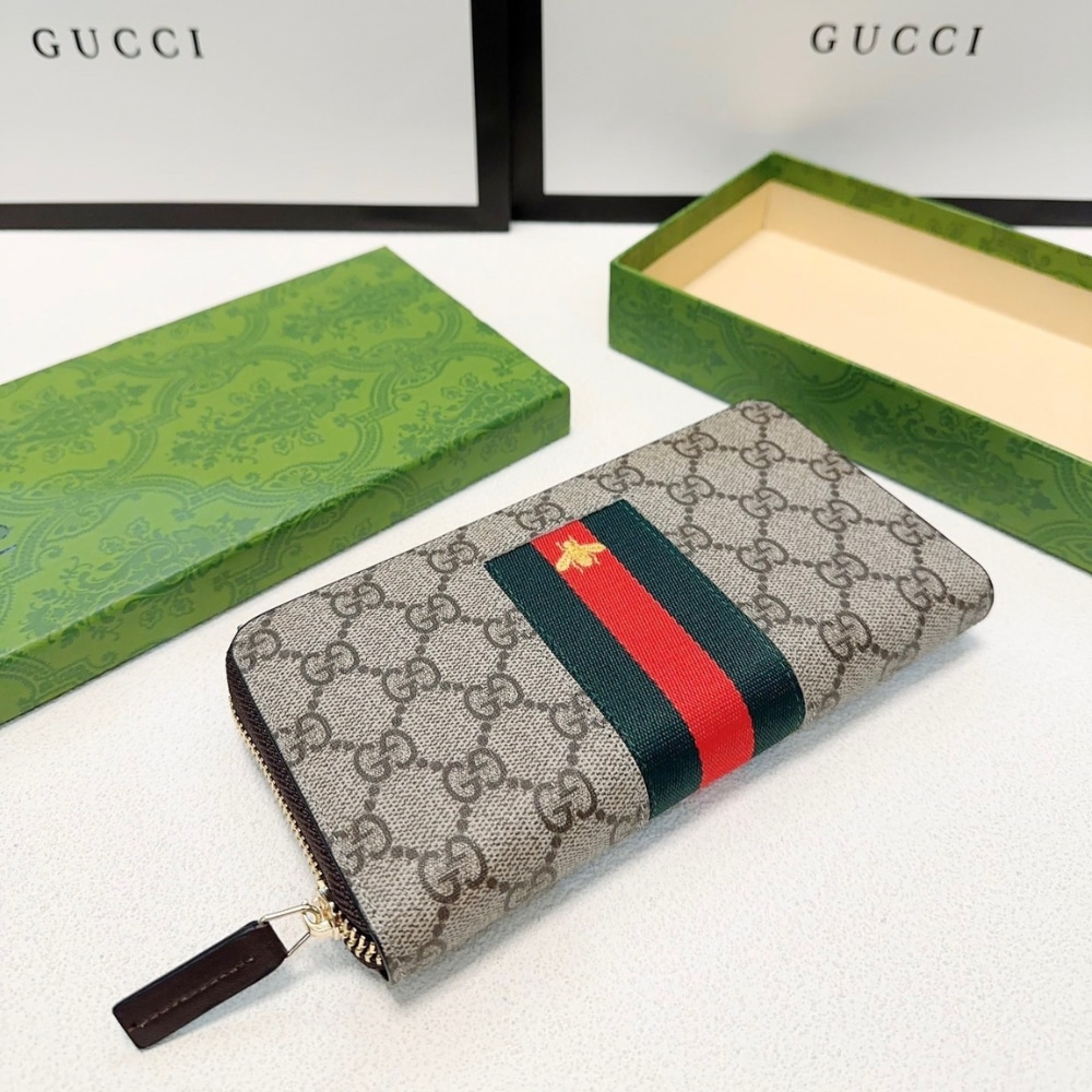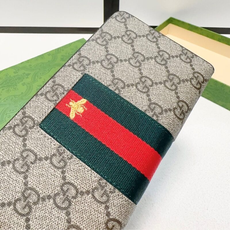 Gucci Supreme Canvas Bee Leather Wallet Long Round Zipper Web Beige Ebony 21 cm / 8.3 inches