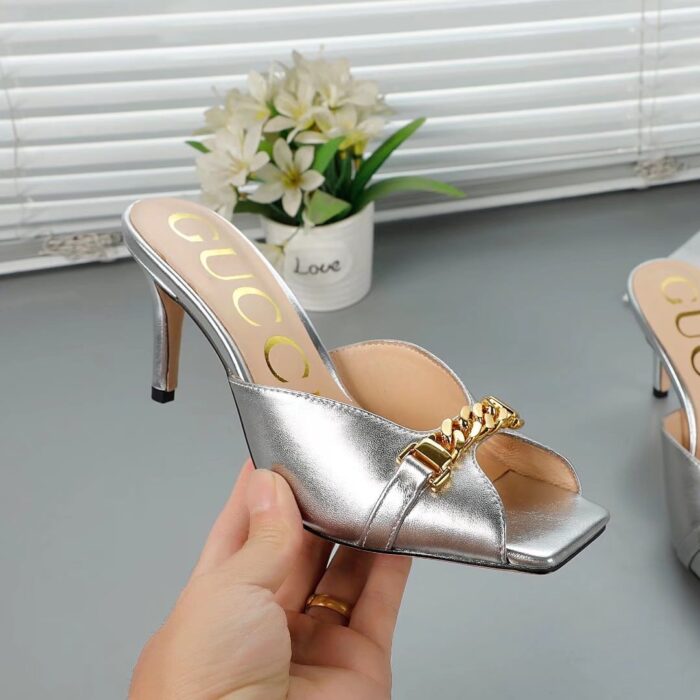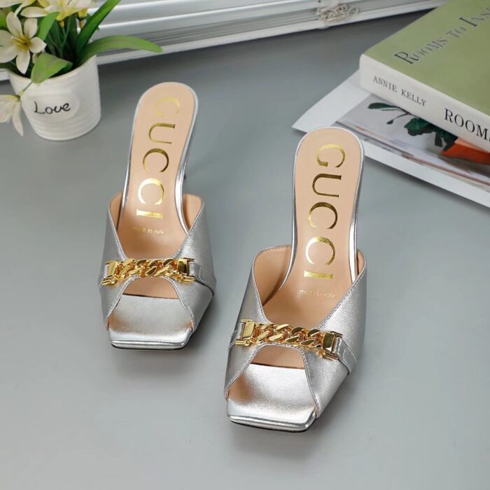 GUCCI SYLVIE CHAIN MULE SANDALS SLIVER LEATHER