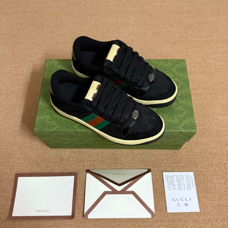 Influenced by classic sneakers from the 1970s, the Screener sneakers is named for the defensive sports move. This variation, in classic leather, features the unique green and red Web stripe on the side and the vintage Gucci logo complete the style.