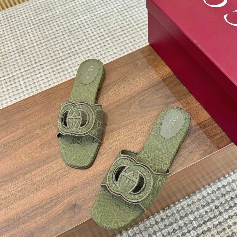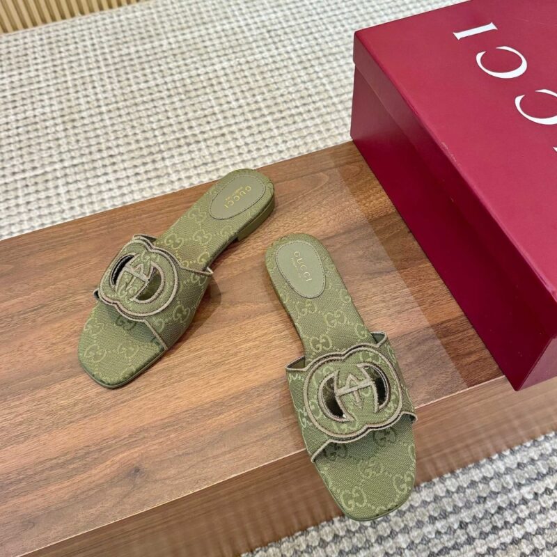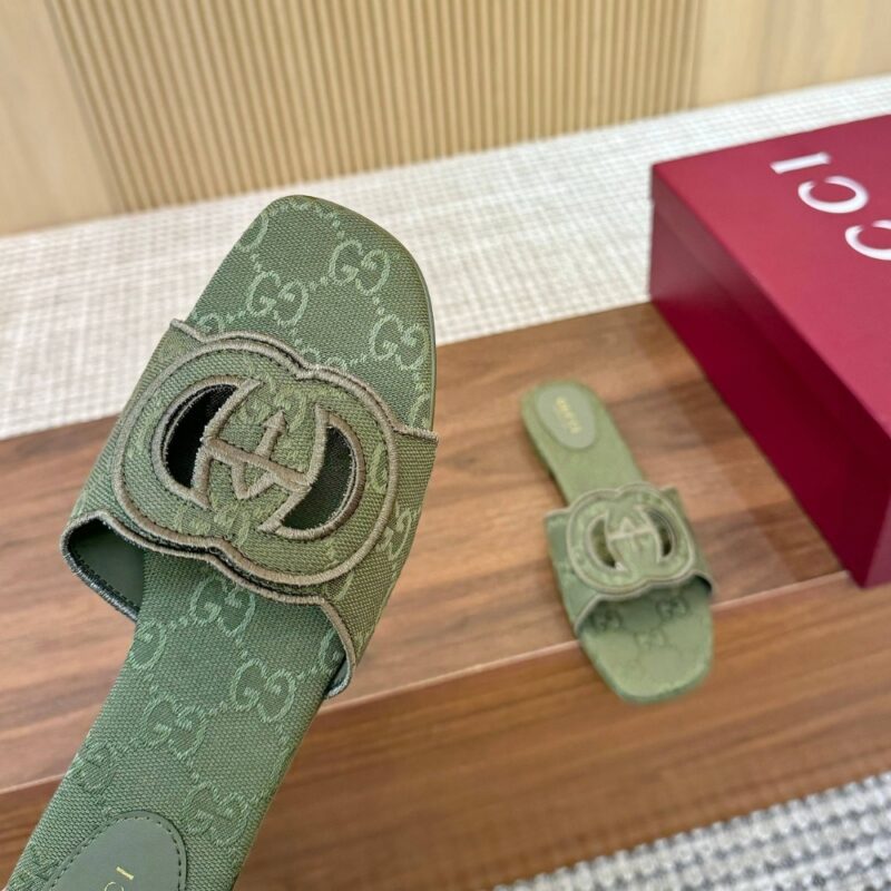 GUCCI WOMEN SLIDE SANDAL WITH INTERLOCKING G GREEN GG CANVAS‎ ‎790447 9SF00 3005