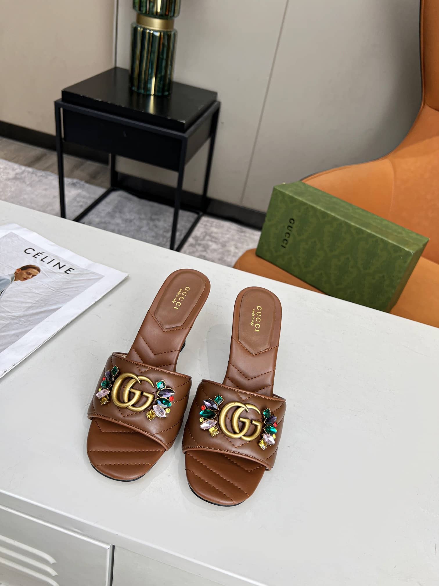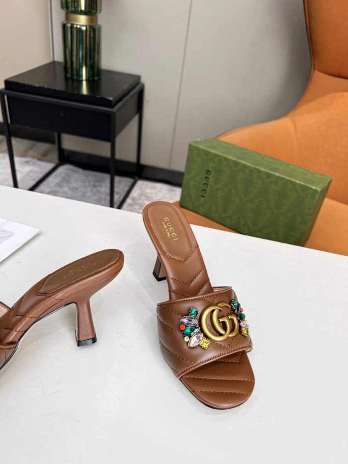 GUCCI WOMEN’S FLOWER DOUBLE G SLIDE SANDAL BROWN