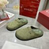 Gucci continues to feature archival symbols in the Pre-Fall 2025 collection. The Horsebit hardware recalls the House’s equestrian heritage, appearing atop this pair of GG canvas mules in dark green.