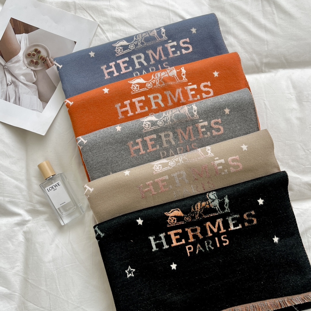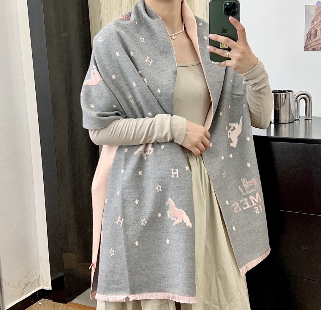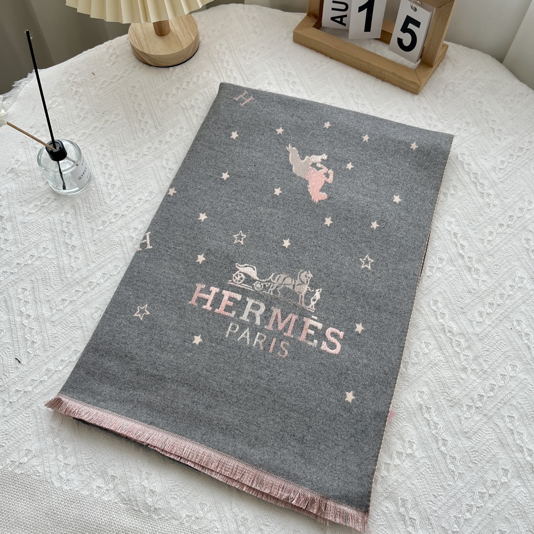 HERMES CASHMERE SCARF BIG TASSELS STAR SHAWL HORSE GREY