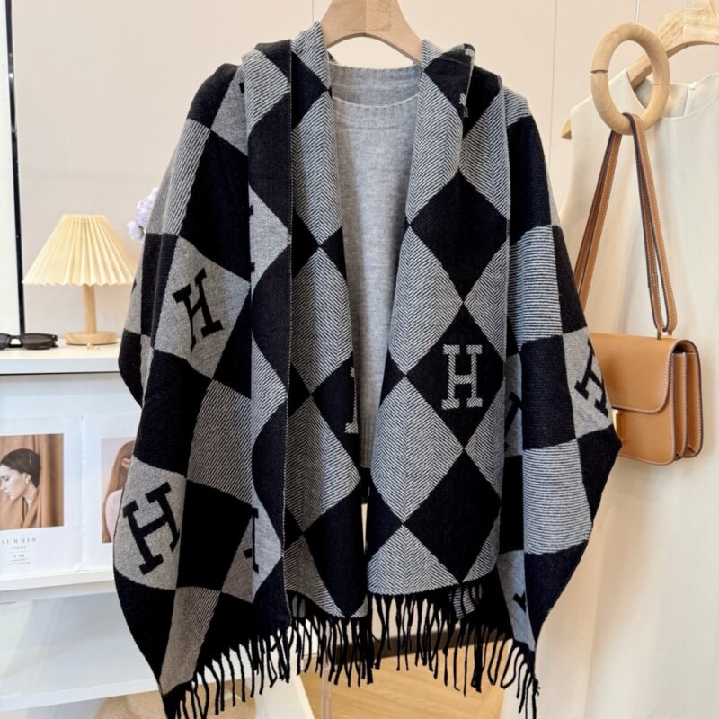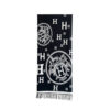 The Hermès Diamond H Logo Wool Shawl in dark navy blue is a luxurious accessory featuring an intricate jacquard-woven diamond motif with contrasting “H” signatures. Crafted from wool and cashmere blend, its generous proportions allow it to be styled elegantly as both a voluminous wrap or a classic muffler. Finished with delicate fringed edges, this timeless piece perfectly combines the Maison’s equestrian heritage with modern geometric design.