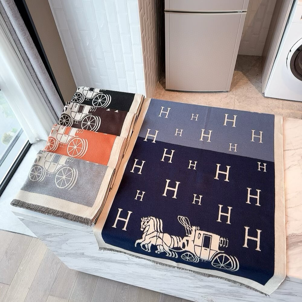The Hermes Equipage Equestrian Horse H Scarf is a accessory that showcases the Maison’s heritage through a blend of wool and cashmere. It features a modern bi-color blue design adorned with scattered “H” logos and a large “Caleche” horse-drawn carriage motif at the base. The jacquard weave ensures the intricate pattern is visible on both sides, while delicate fringed edges complete its refined look. With its generous proportions, this versatile piece can be styled as a long scarf or a sophisticated shawl for any occasion.