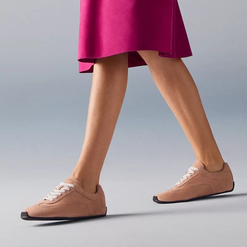These Hermès sneakers boast an elegant and sophisticated look. The minimalist design is highlighted by an embroidered “H” logo on the side, paired with white laces and a contrasting black rubber sole. These sneakers are designed for comfort and style, perfect for those who appreciate luxury.