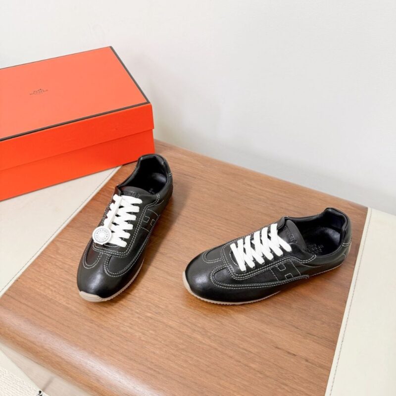 These Hermès sneakers boast an elegant and sophisticated look. The minimalist design is highlighted by an embroidered “H” logo on the side, paired with white laces and a contrasting black rubber sole. These sneakers are designed for comfort and style, perfect for those who appreciate luxury.