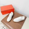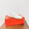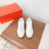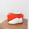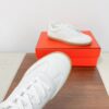 This pair of Hermes white leather sneakers offers a clean, sophisticated look with minimalist detailing. The shoes are crafted from smooth white leather with subtle perforated accents forming the iconic “H” logo on the sides. The fine contrast stitching in warm white adds a touch of elegance, while the sturdy rubber sole ensures durability and comfort.