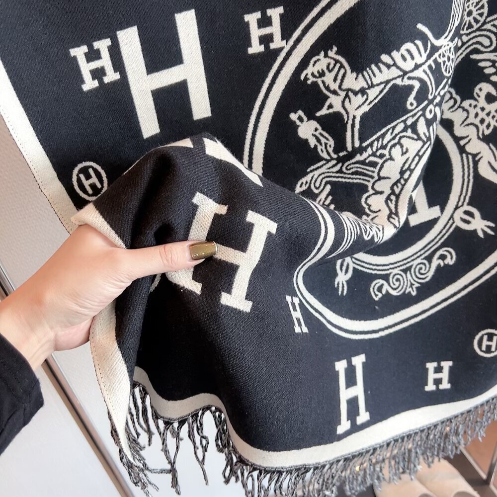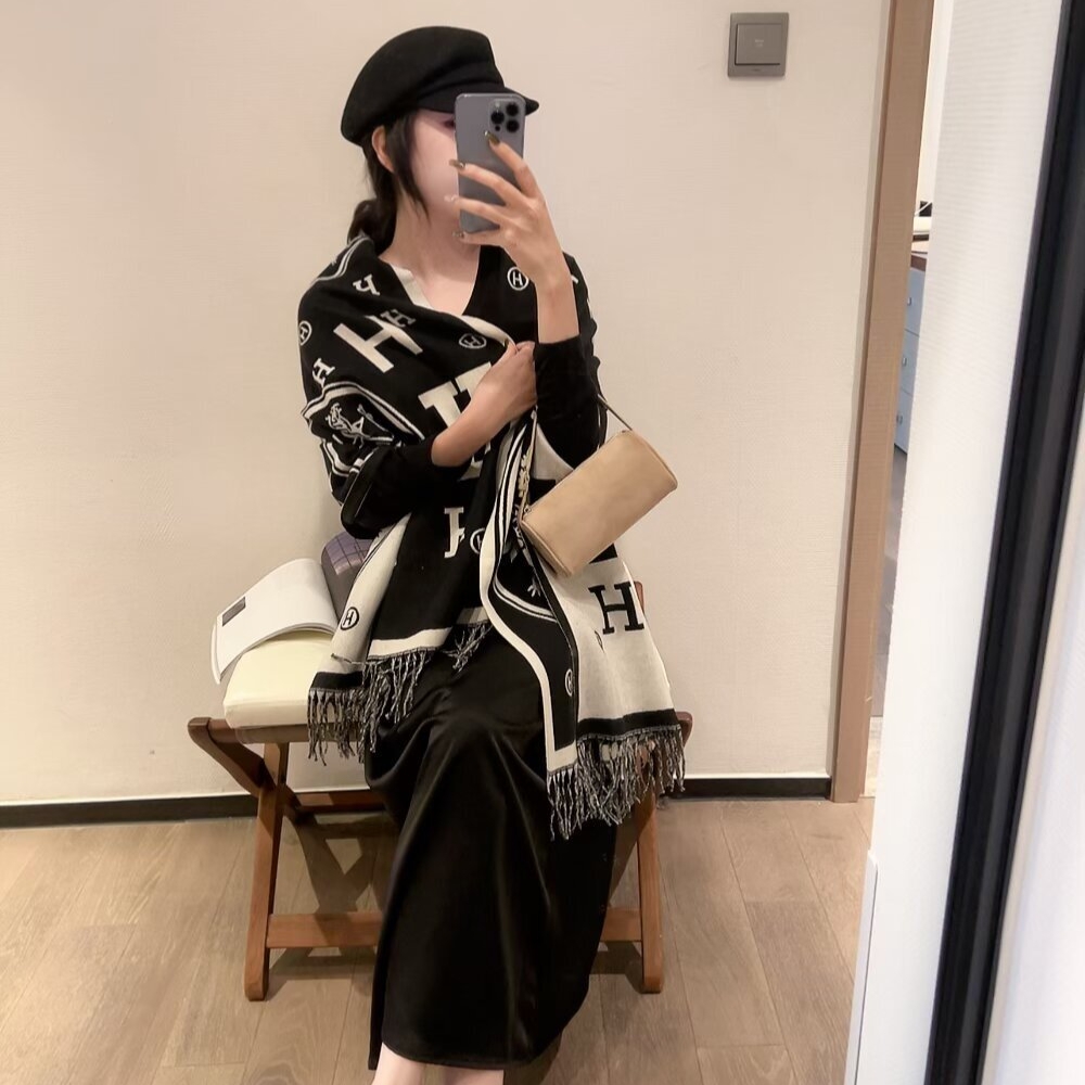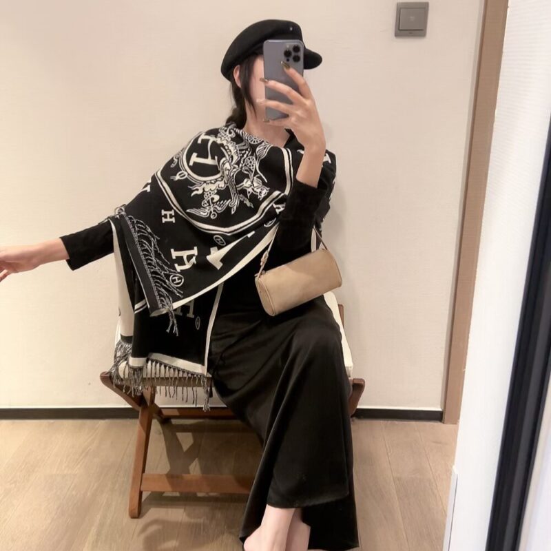 The Hermes Muffler H Logo Wool Shawl in black is a sophisticated accessory crafted from a blend of wool and cashmere for exceptional warmth. It features a striking jacquard-woven design with large “H” logos and the iconic Caleche motif, finished with delicate fringed edges. This versatile 180cm piece can be styled as a classic scarf or a refined shawl, making it a timeless statement for any cold-weather wardrobe.