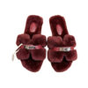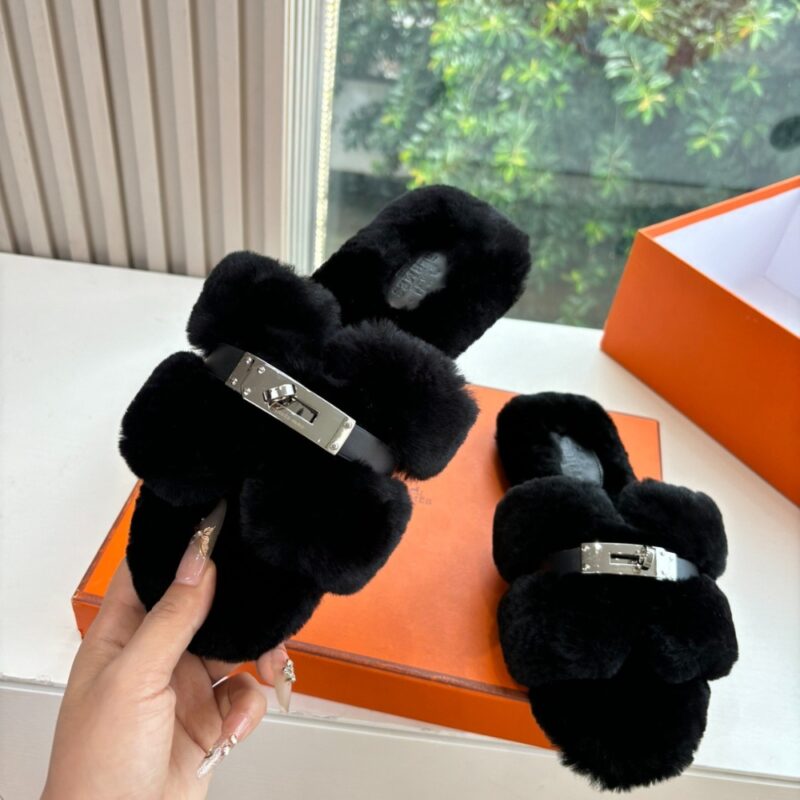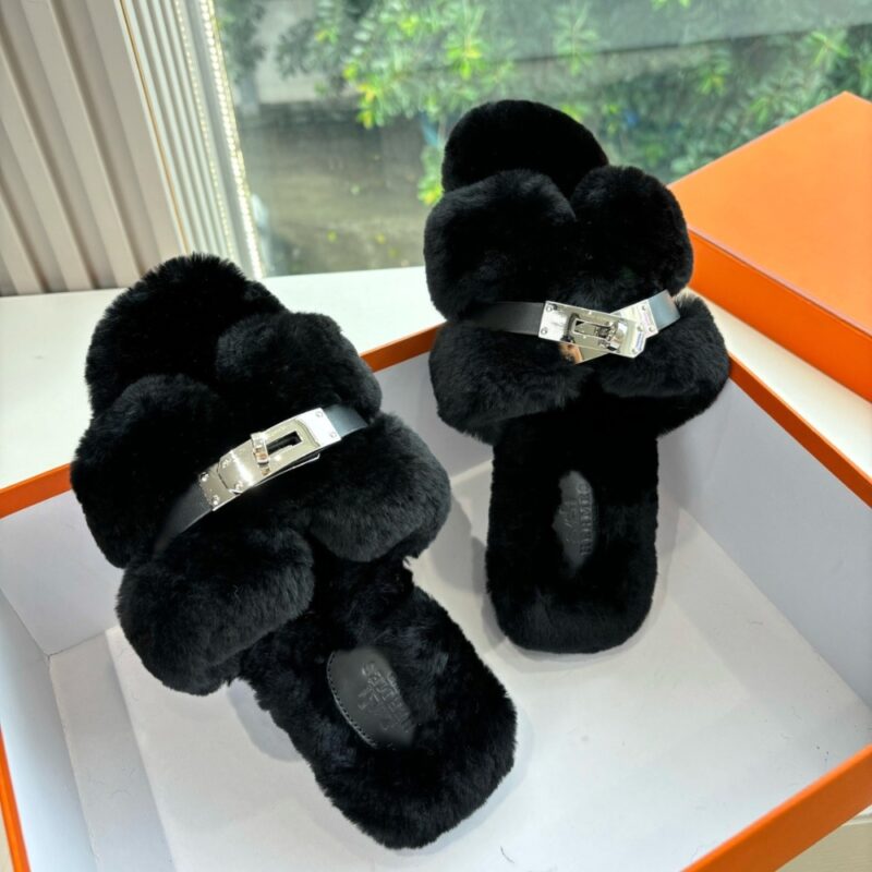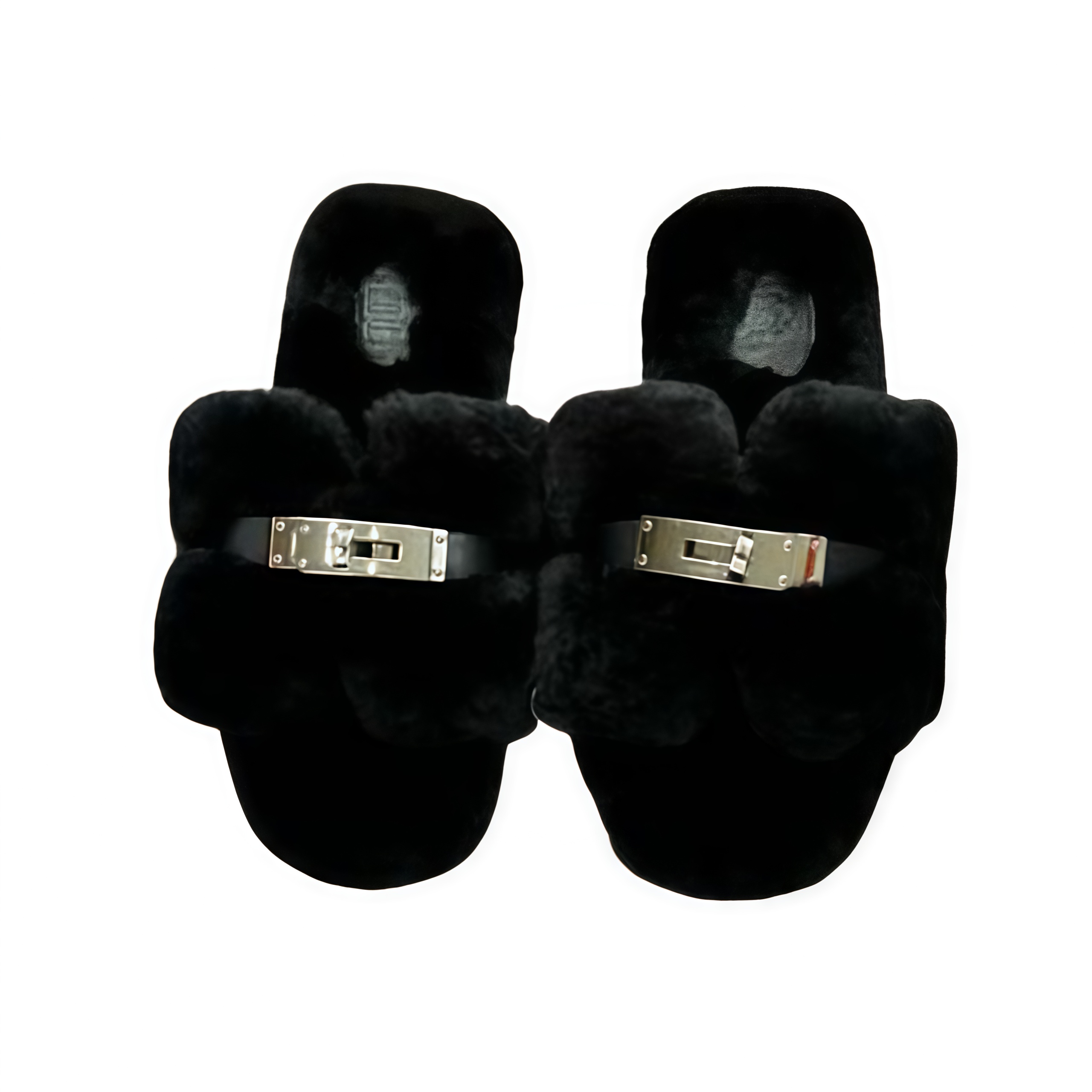 HERMES SHEARLING FUR ORAN SILVER BUCKLE SANDAL BLACK
