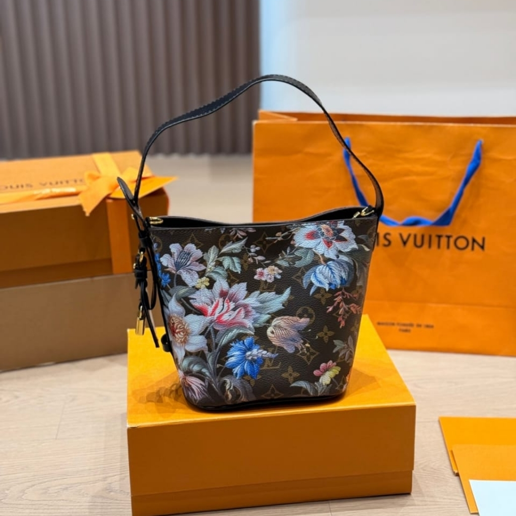 A reinterpretation of the Monogram Eden collection, the All In BB bag makes its mark with Monogram Canvas Ebene adorned with vibrant floral patterns. The classic bucket silhouette is trimmed in leather and accented with details such as a gold-tone lock and the signature LV name tag. Inside, there’s a detachable zippered pouch and enough space to hold a phone, wallet, and keys.