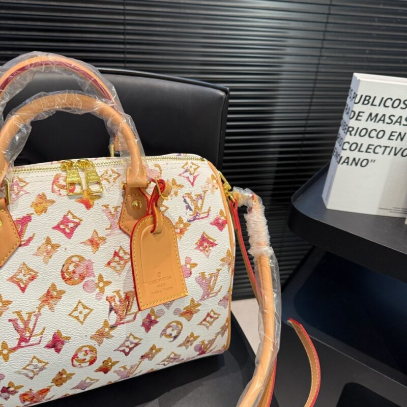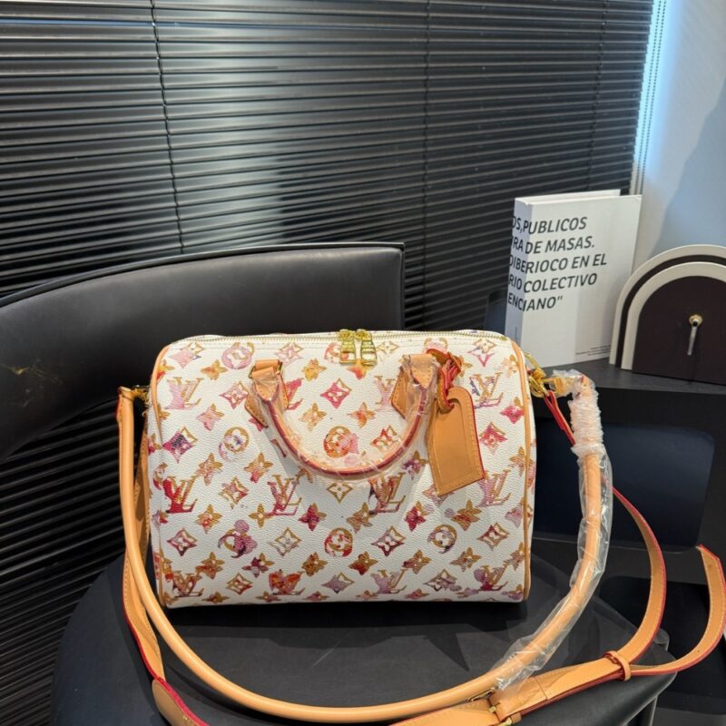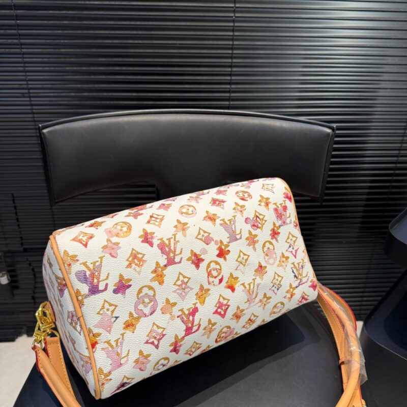 The Louis Vuitton Aquarelle Watercolor Speedy 35 in white is a rare and vibrant collector’s piece that reimagines the classic silhouette through a creative, artistic lens. Featuring the stunning Monogram Watercolor canvas designed by Richard Prince. The structured doctor-bag shape is elegantly complemented by leather trim, rolled top handles, and polished gold-tone hardware for a sophisticated finish. Its spacious interior, lined in soft textile, provides ample room for all your essentials, making it an ideal choice for the fashion enthusiast who appreciates a blend of heritage craftsmanship and modern art.