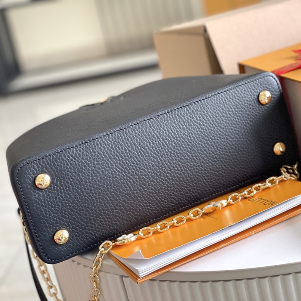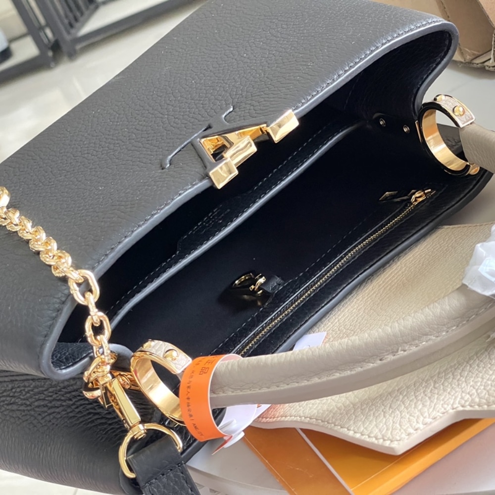 As feminine as it is sophisticated, this Capucines BB handbag in leather features a removable chain adorned with Monogram Blossoms inlaid with enamel. The pale colorway, with different colors on the top handle, flap, and body, make this bag unique. In addition to the chain and top handle, there’s a removable shoulder strap.