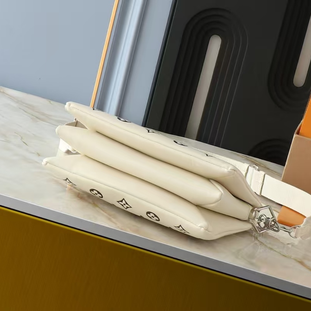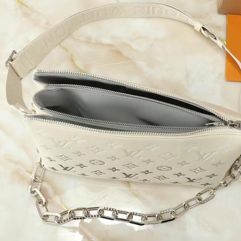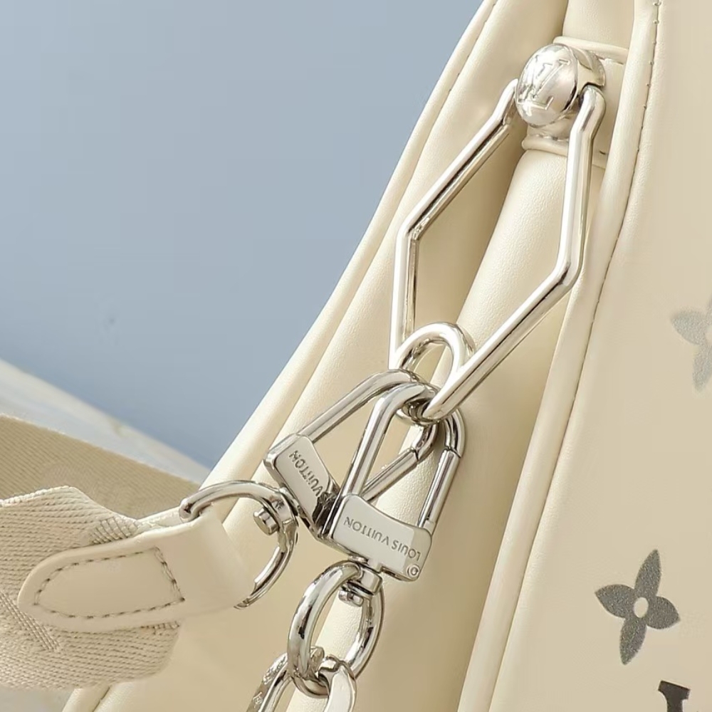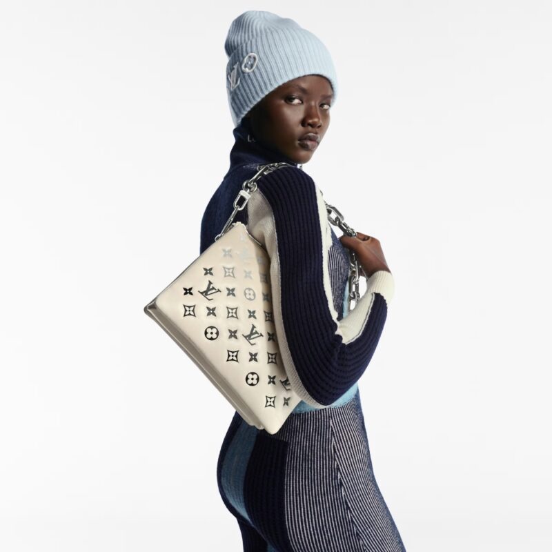 The LV Ski collection offers this brand new edition of the Coussin PM, ready for mountain getaways and beyond. Crafted from leather, it is embossed with the House’s signature Monogram in a unique gradient finish and embellished with a bi-galvanized chain. A key shape for the season, it is sized to fit the essentials, including a wallet, Smartphone and lipstick.