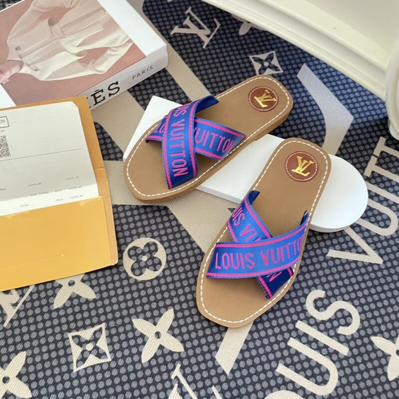 LOUIS VUITTON CROSS STRAP FLAT SLIDES BLUE