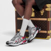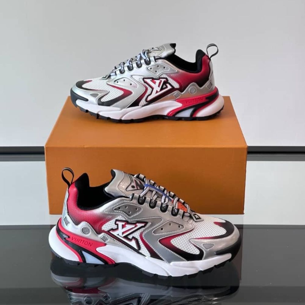 The LV Runner Tatic sneaker is an avant-garde interpretation of a running shoe. It is made from a mix of technical materials, including mesh and metallic varnish, creating a distinctive gradient silver effect. The sporty design of this model is accentuated by the dynamic LV Initials on the side, one of many signature details.