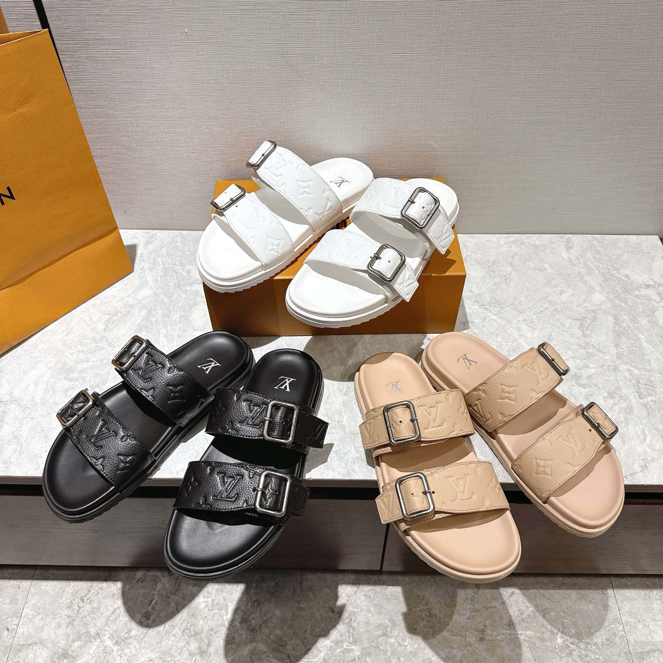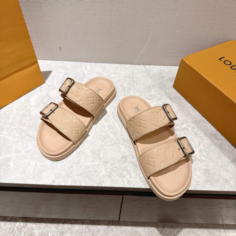 The LV Venice mule is a casual-chic style made of grained leather, which is debossed with the iconic Monogram pattern. The upper features two adjustable straps with large, angular buckles. A padded footbed and supple micro outsole make this model extremely light and comfortable to wear.