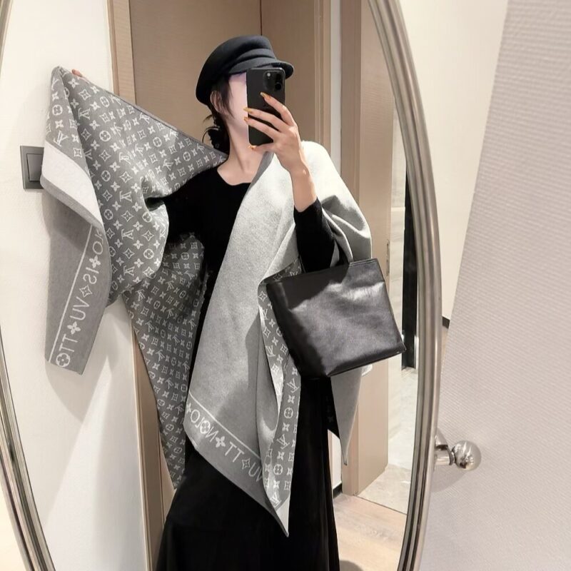 The Louis Vuitton Monogram Cape in grey and white is a sophisticated layering piece that features the House’s iconic Monogram motif in a subtle, contrasting weave. Crafted from a blend that typically includes wool and cashmere, this cape offers a soft, luxurious feel and exceptional warmth for colder seasons. The design is characterized by its elegant, oversized silhouette and draped open front, making it a versatile addition to both casual and formal ensembles. Its jacquard-woven pattern is visible on both sides, and it is finished with a refined Louis Vuitton signature along the hem for a signature touch of luxury.