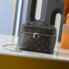 The Nice Mini vanity case is made from Monogram Macassar coated canvas with colored piping along the top and a matching-colored leather handle. Small and supple, it fits easily into a travel bag. The bag’s washable lining is in the same color as the exterior details and features a striped pattern from the House’s archives.