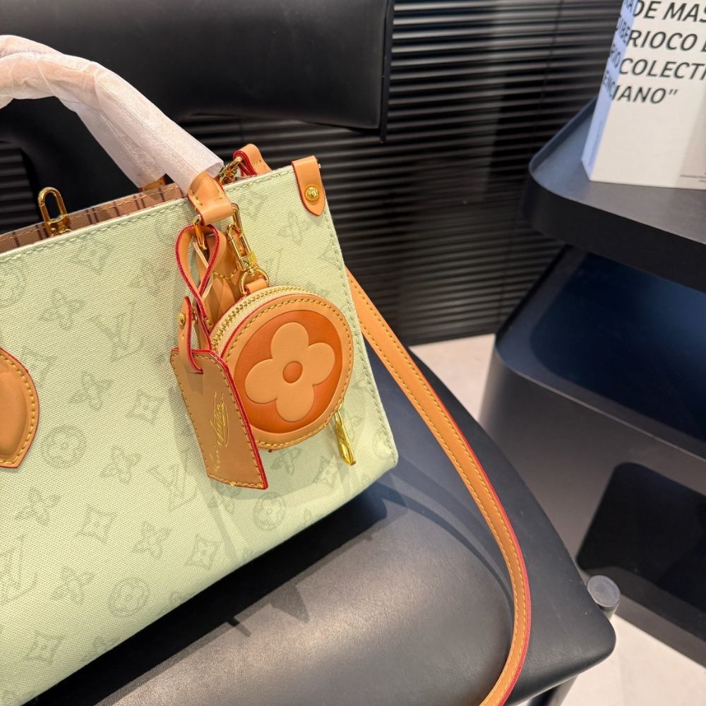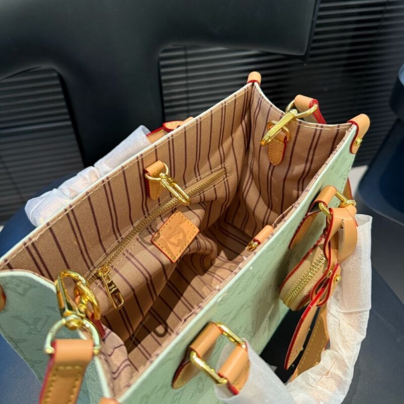 To celebrate the 130th anniversary of the Louis Vuitton Monogram pattern, this OnTheGo PM bag is reimagined in a stylish Monogram Origine Vert Asnières hue. Crafted from Monogram Origine canvas, inspired by the original design and exuding a vintage charm, the bag is accented with a leather shoulder strap, handles, and the iconic luggage tag. The interior features a striped lining and two pockets, one of which is zipped, for convenient storage of small valuables.