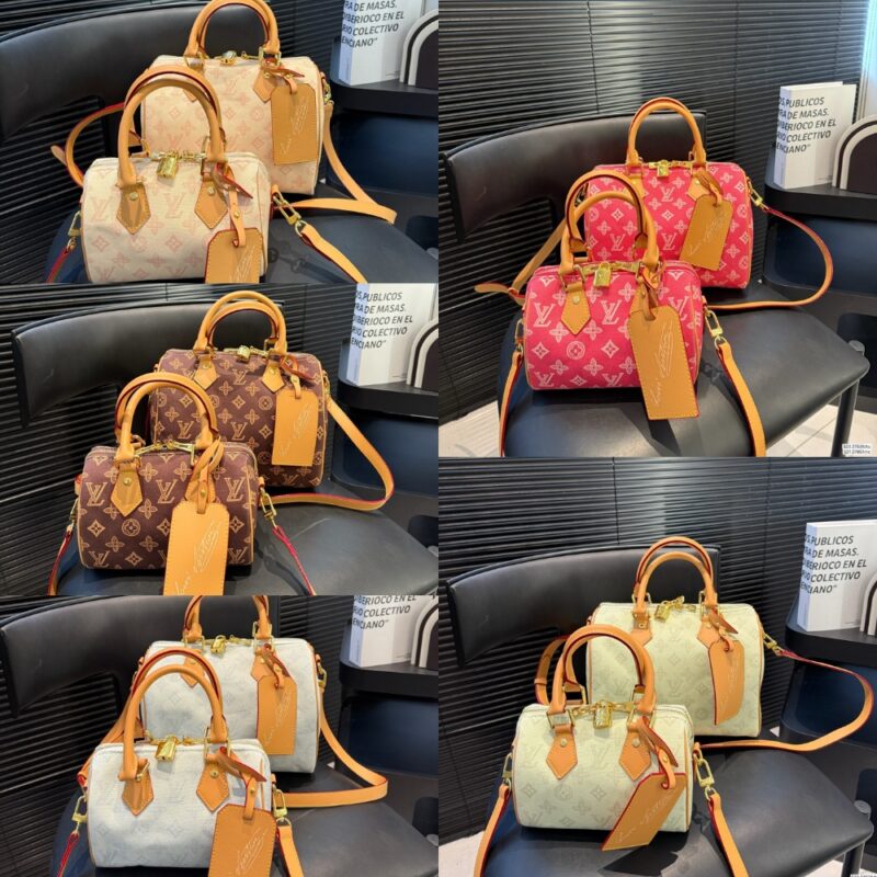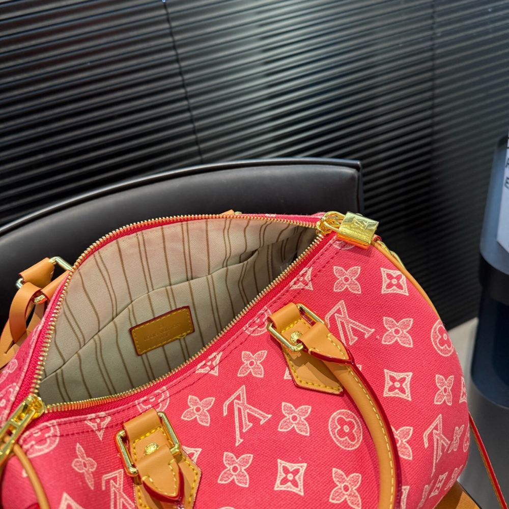 The Speedy Bandoulière 25 bag is reimagined in Monogram Origine canvas, a vintage-inspired update on the iconic Louis Vuitton pattern, which celebrates its 130th anniversary in 2026. This edition is offered in a vibrant Pink hue, trimmed with a smooth cowhide strap and celebratory address tag. The compact style is perfect for everyday and includes a flat pocket inside for smaller items.