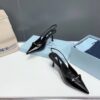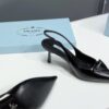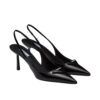 These pumps expressing sophisticated, feminine elegance are made of brushed leather, an emblematic material of Prada since the 90s traditionally used for luxury footwear. The triangle logo returns as a slightly padded leather detail and inspires the geometric line of the heel, which gives the silhouette a modernist note.