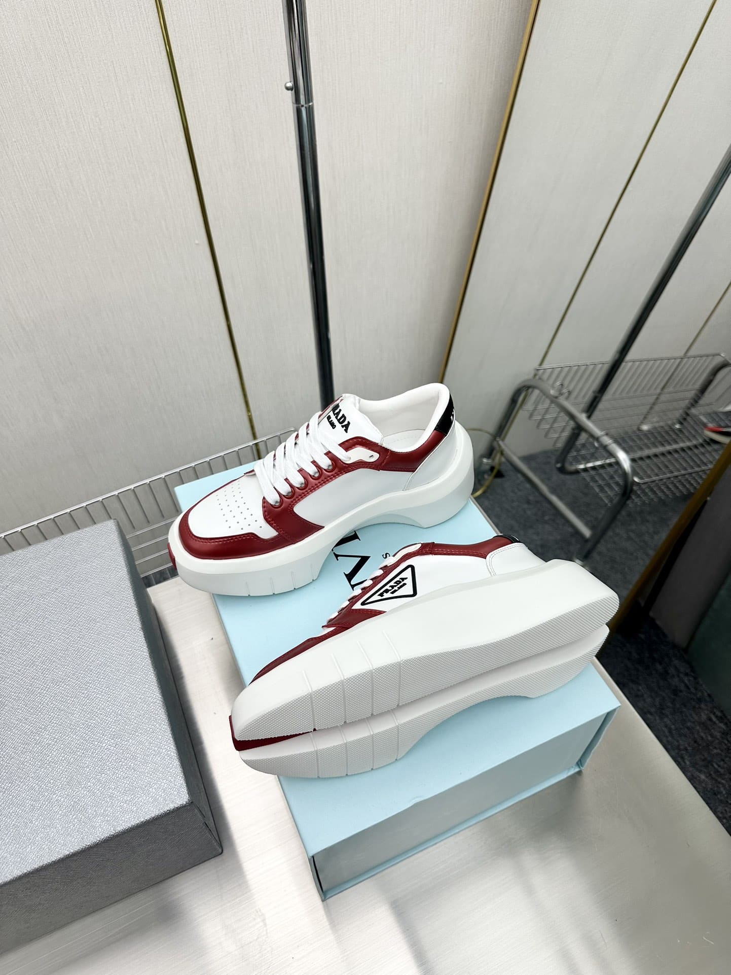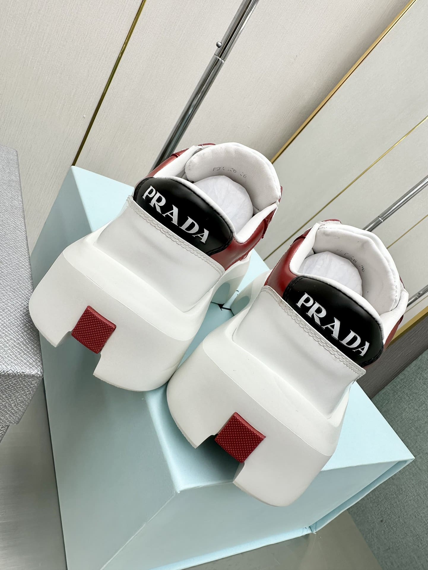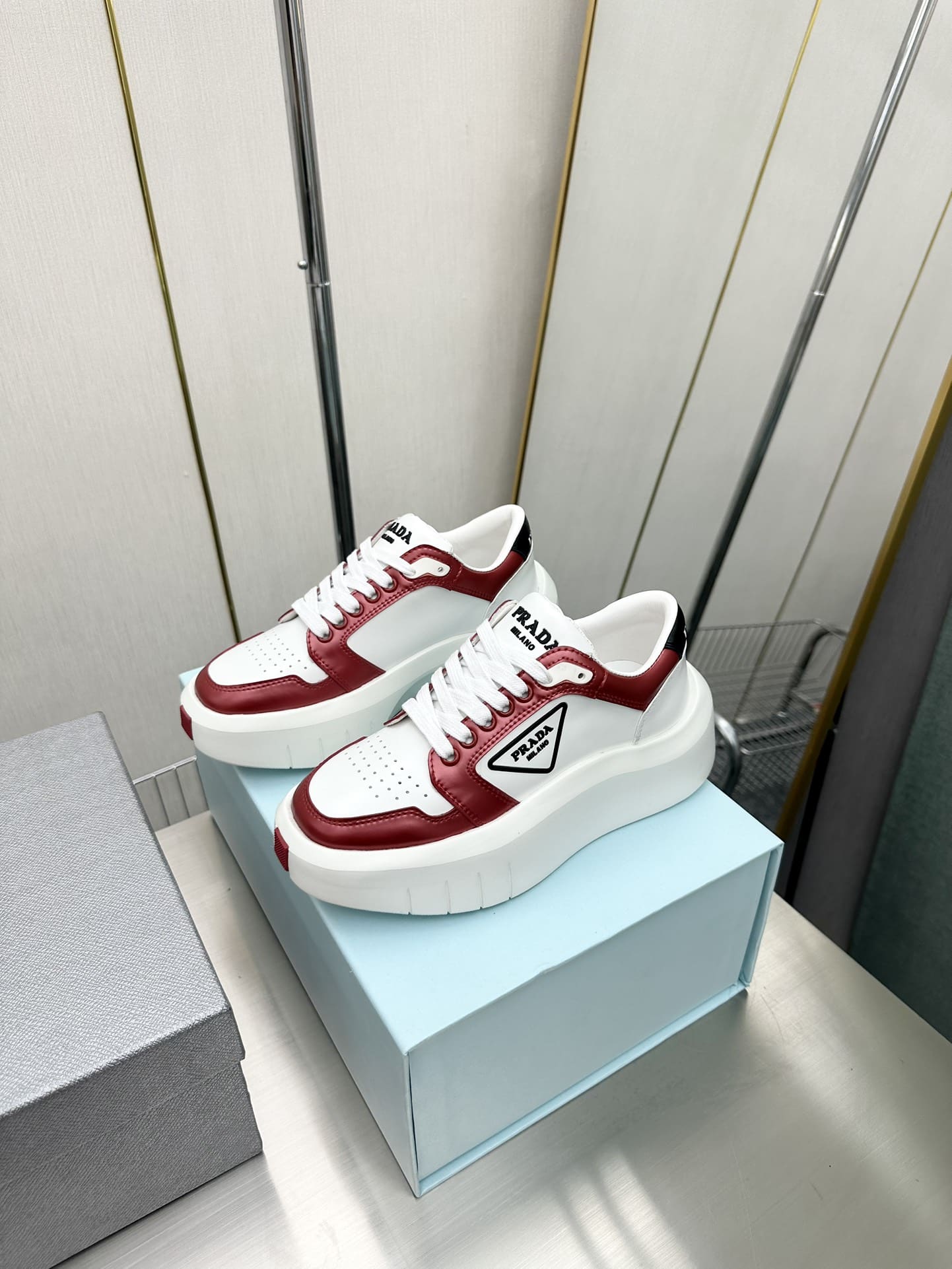 PRADA LEATHER PLATFORM SNEAKERS WHITE AND RED