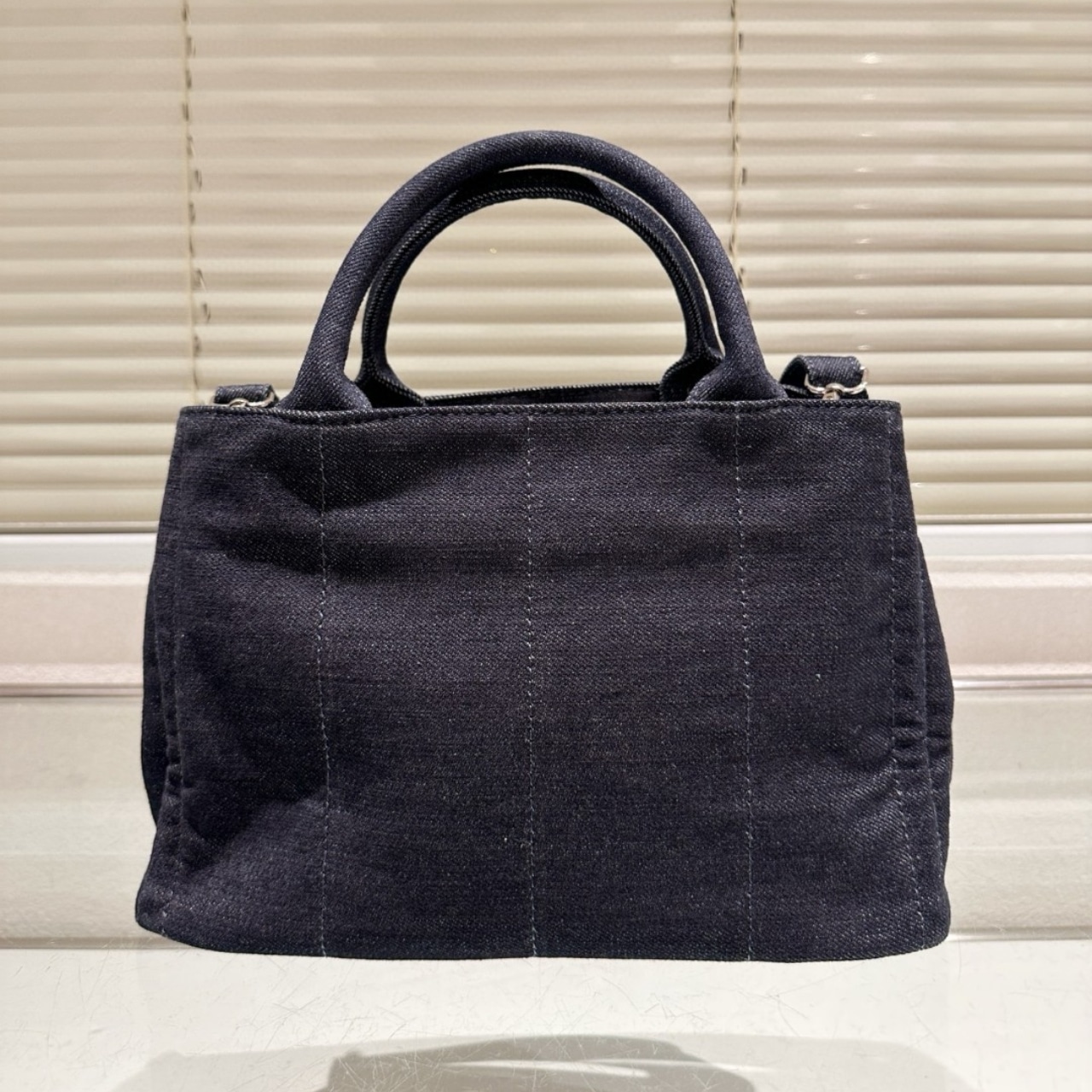 PRADA LOGO PRINTED DENIM TOTE BAG BLACK 26CM
