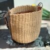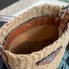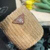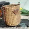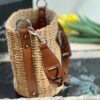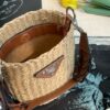 - Crocheted with raffia into the shape of a bucket, and then matched with a brown leather woven handle, as well as a triangular LOGO logo and side.