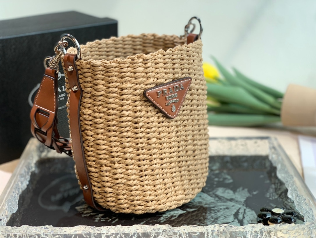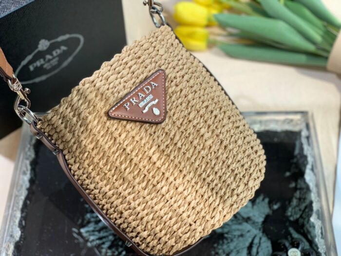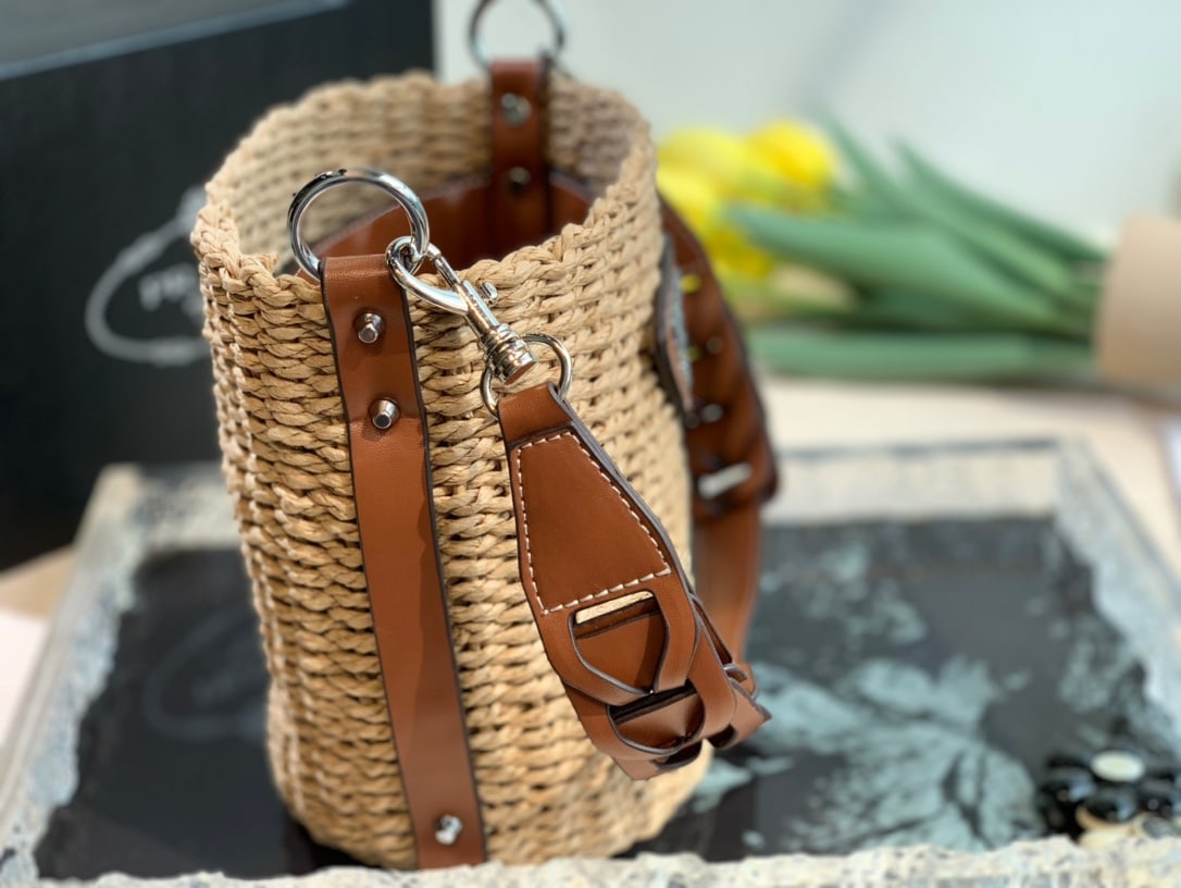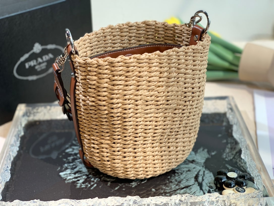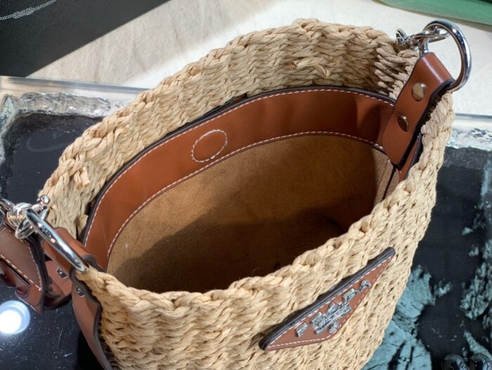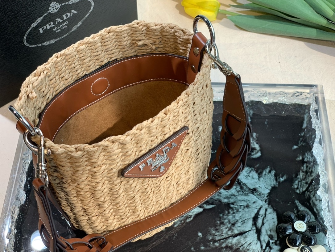 PRADA RAFFIA AND LEATHER BUCKET BAG 21CM