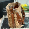 - Crocheted with raffia into the shape of a bucket, and then matched with a brown leather woven handle, as well as a triangular LOGO logo and side.