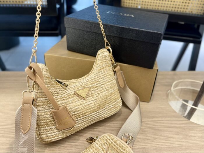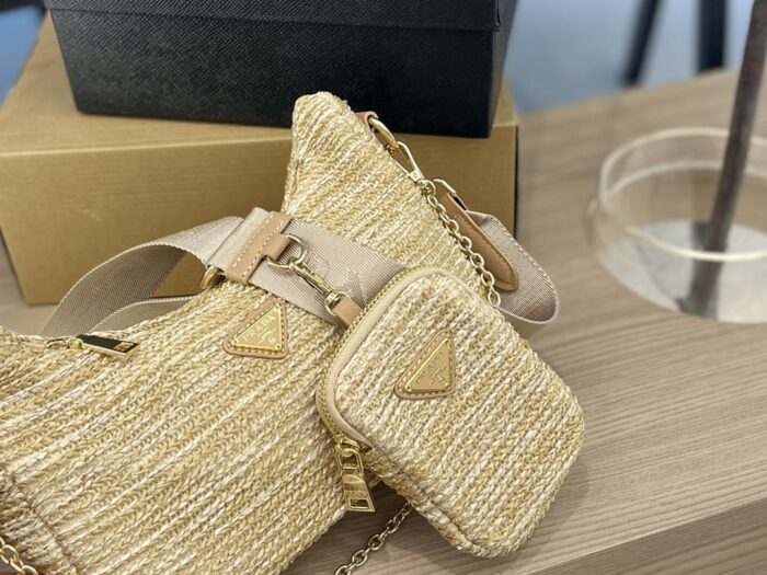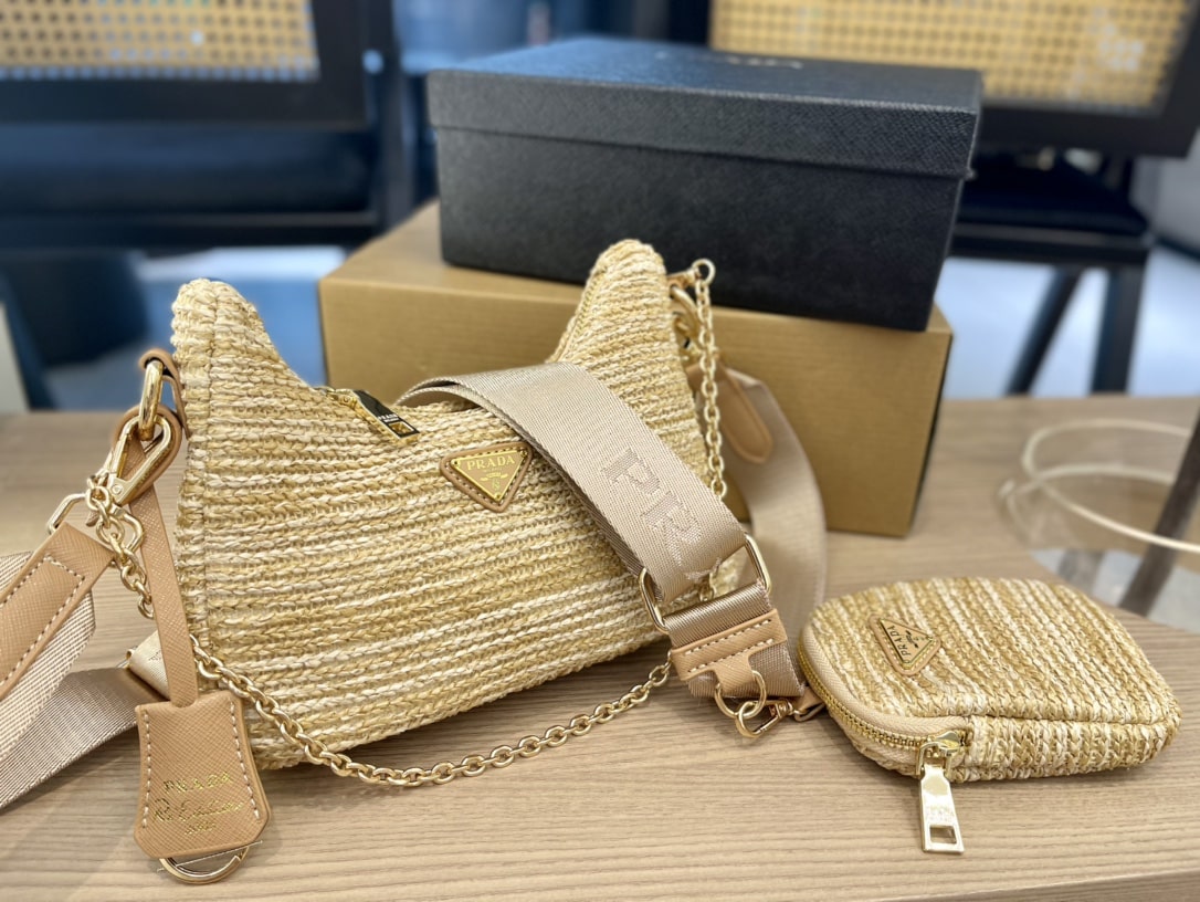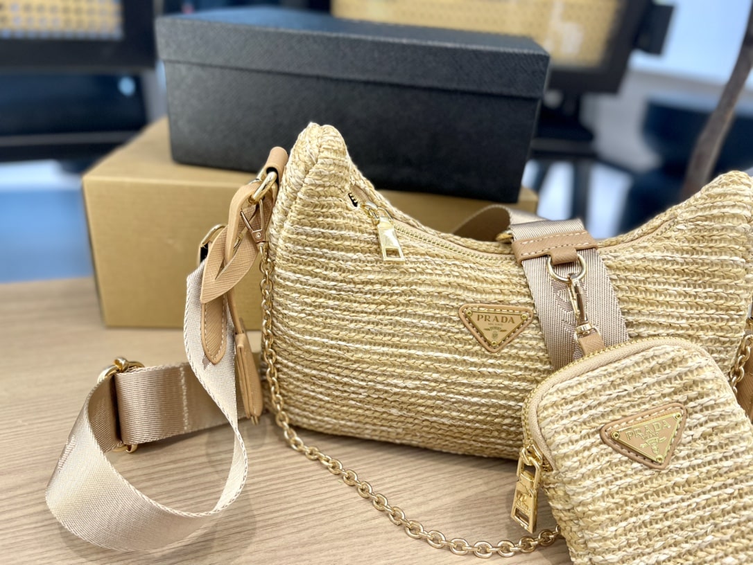 - Removable raffia zipper pouch and Re-Edition keychain