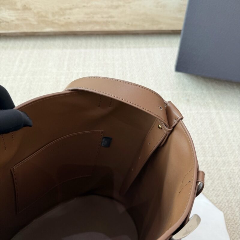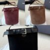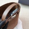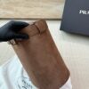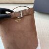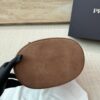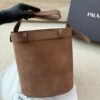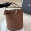 The Prada Suede Buckle Bucket Bag in brown is a sophisticated blend of utilitarian design and luxurious texture, showcasing the Maison’s expert leather craftsmanship.