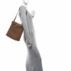 The Prada Suede Buckle Bucket Bag in brown is a sophisticated blend of utilitarian design and luxurious texture, showcasing the Maison’s expert leather craftsmanship.