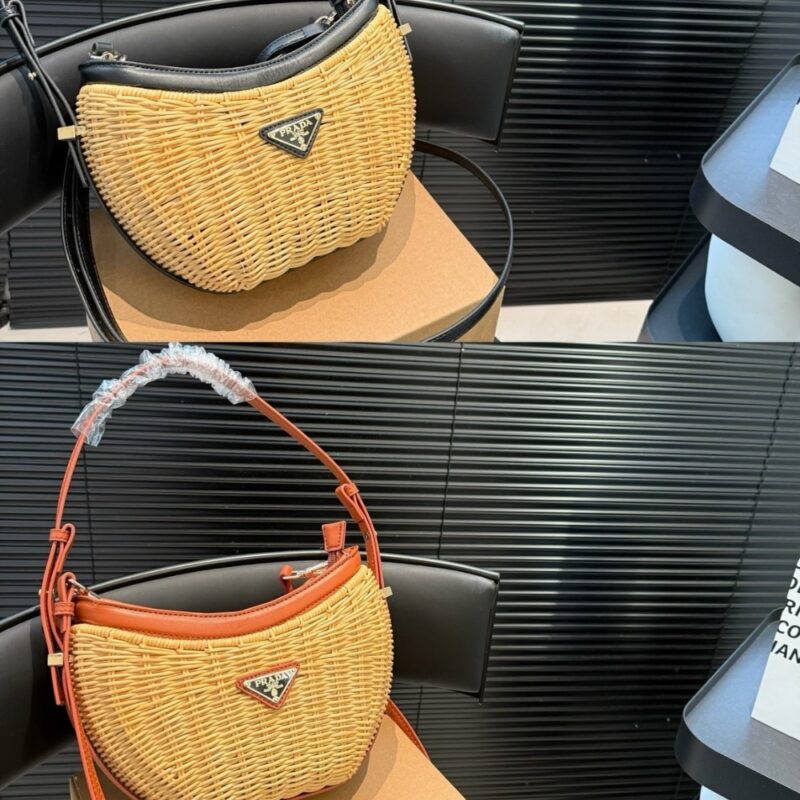 Prada Wicker And Leather Arqué Bag Tan 1BC202 2CYF F0018 V OOO / 22cm / 8.7 inches