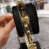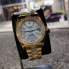 - Cornflower blue dial with yellow gold-tone hands and diamond-set index hour markers.