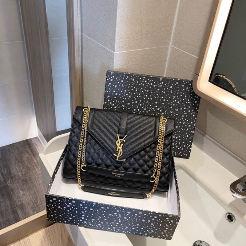 This Saint Laurent shoulder bag is crafted from premium quilted leather, featuring a sleek envelope silhouette and the iconic YSL Cassandre logo in gold-tone hardware. Designed with a versatile chain strap, it can be worn on the shoulder or crossbody for effortless day-to-night styling. A timeless luxury handbag, it’s perfect for elevating both everyday outfits and evening looks.