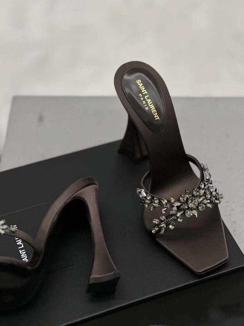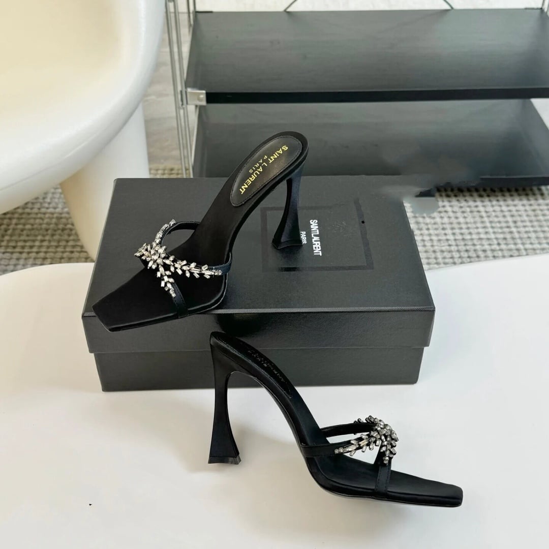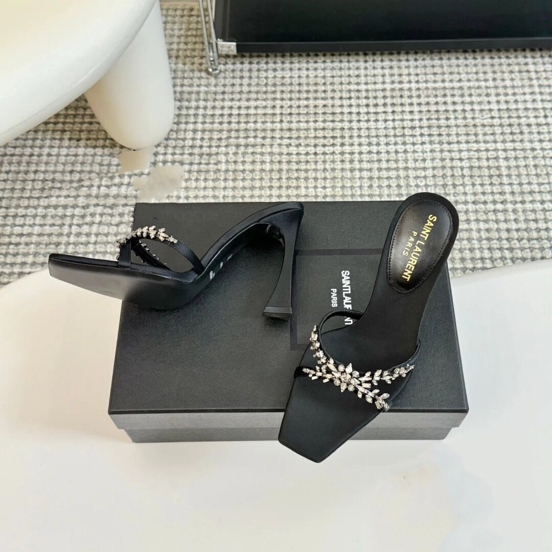 SAINT LAURENT LIZ MULES IN SATIN AND RHINESTONES BLACK