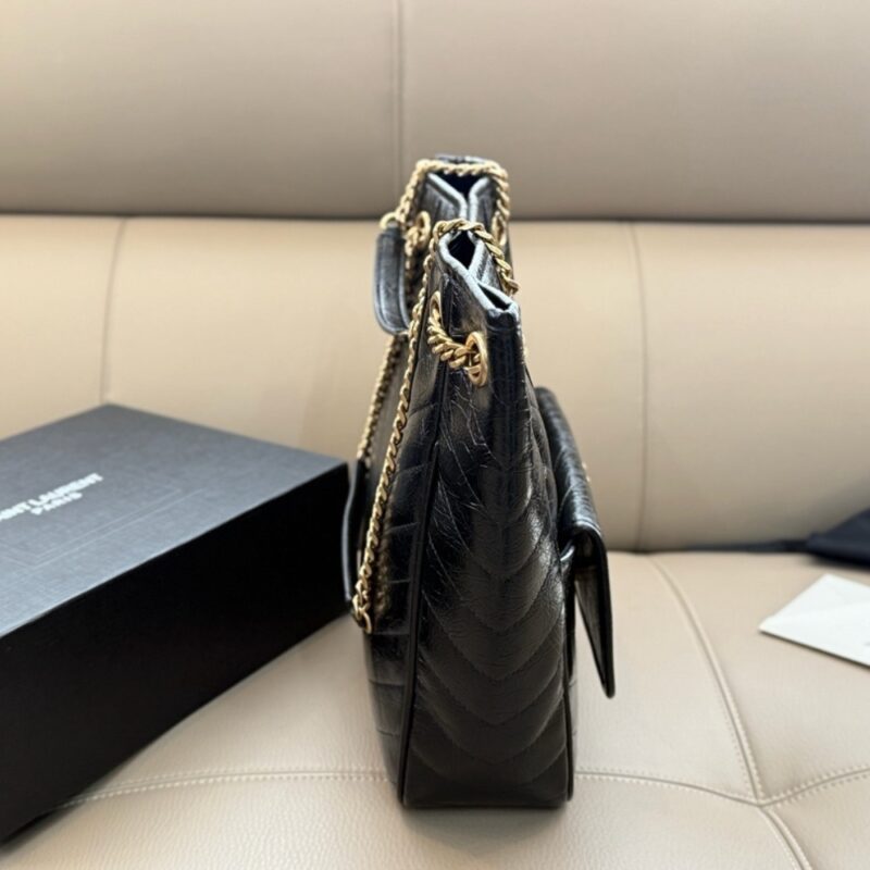 Shopping bag in vintage, decorated with the Cassandre and chevron-quilted topstitching. This lightweight, functional bag features a front pocket and sliding chain strap for both shoulder and crossbody carry.