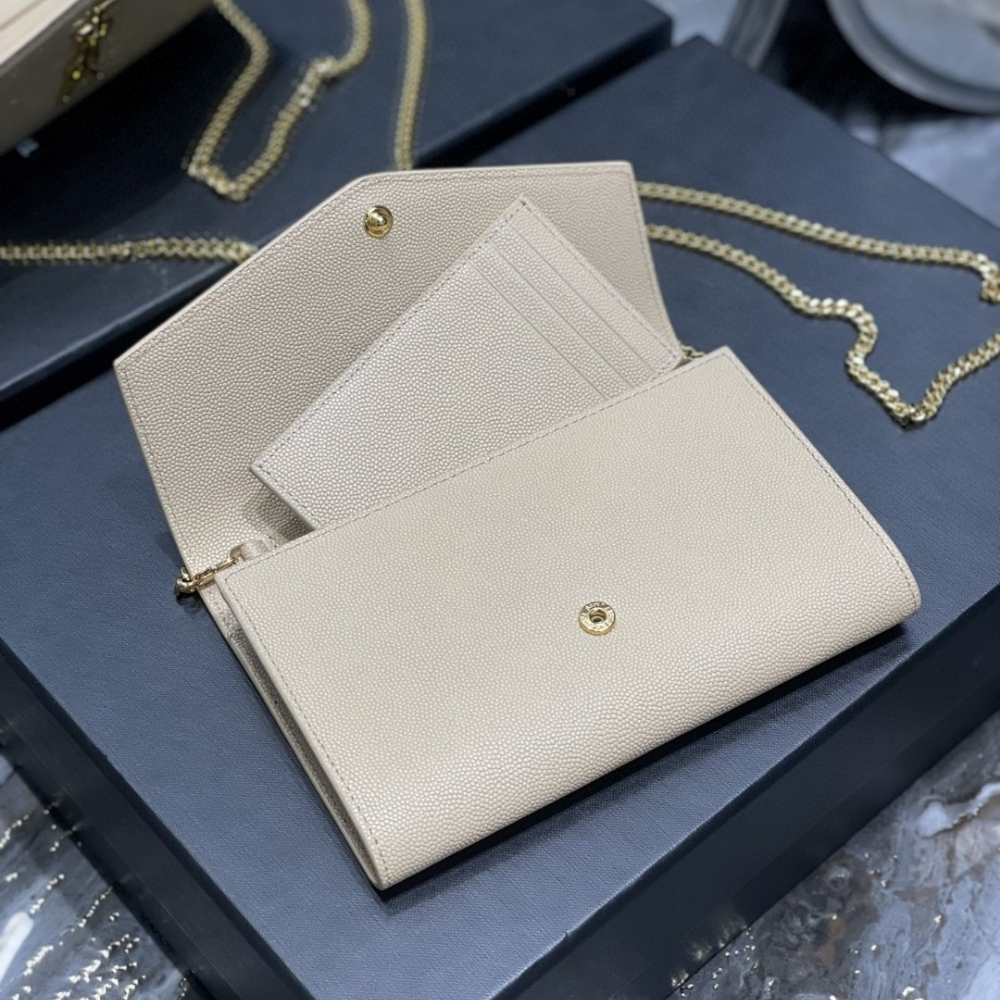 Saint Laurent Uptown Chain Wallet / In Grain De Poudre Embossed Leather / White / 7.5 x 4.7 x 1.2 inches / Gold-toned hardware / Crossbody Bag