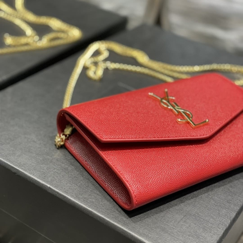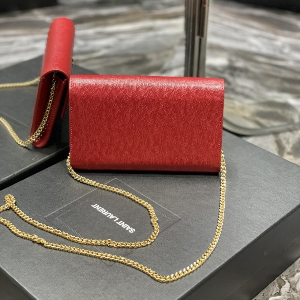 Saint Laurent Uptown Chain Wallet / In Grain De Poudre Embossed Leather / Red / 7.5 x 4.7 x 1.2 inches / Gold-toned hardware / Crossbody Bag