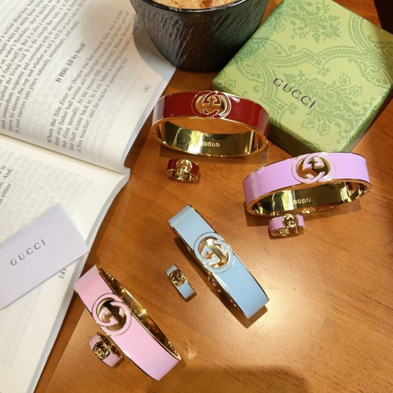 This Gucci Interlocking Set features a cuff bracelet and ring crafted in a radiant gold-tone finish with striking Gucci Rosso Ancora red enamel. Both pieces showcase a contemporary cut-out formation of the iconic Interlocking G, echoing the sophisticated color palette of the Pre-Fall 2025 collection. This coordinated set combines modern geometric design with a deep heritage hue, making it a bold and timeless statement for any luxury jewelry enthusiast.
