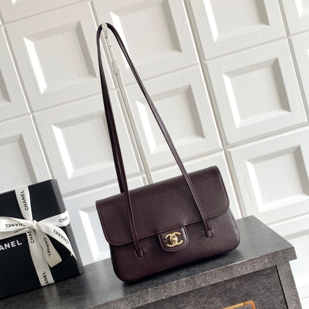 The features a classic flap silhouette with the iconic CC turn-lock closure on the front and long leather shoulder straps for an elegant carry. The compact 22cm design offers a refined and minimalist look, making it a versatile choice for daily wear, evening outings, or polished city styling.