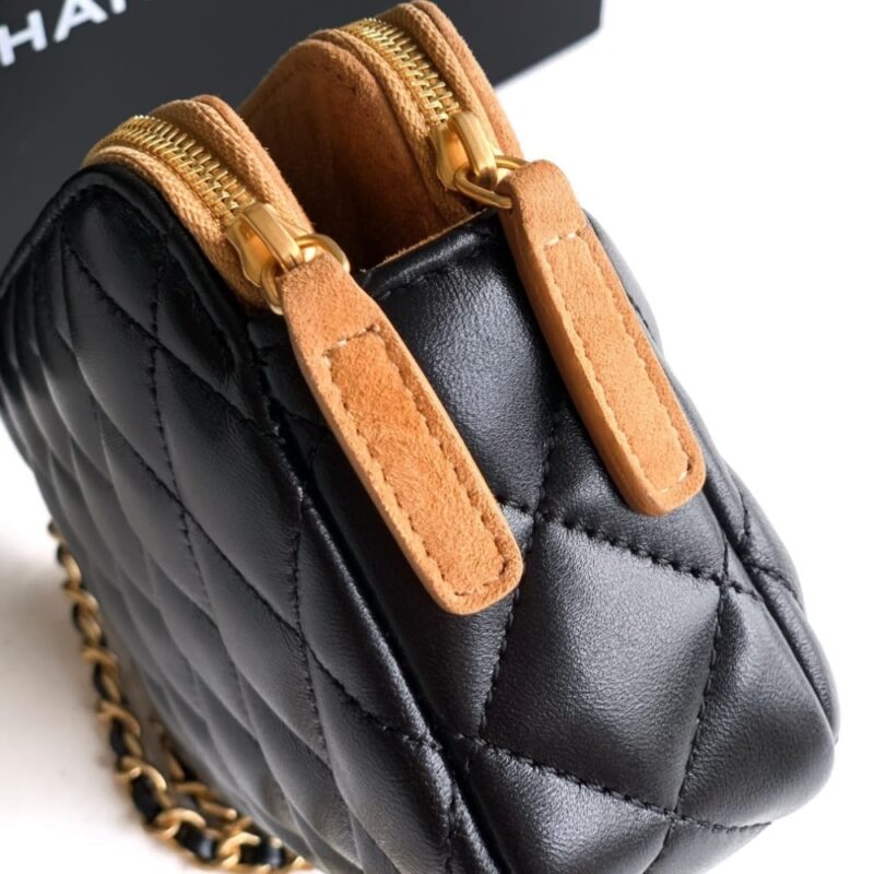 [SUPER VIP 1:1] – CHANEL ZIPPED PHONE HOLDER WITH CHAIN SHINY AND GOLD TONE METAL BLACK BEIGE 18CM AP4743 B20685 U1546