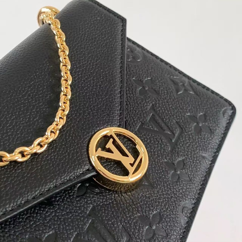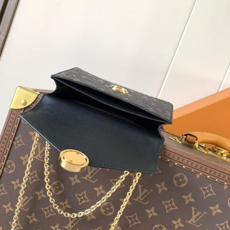 Functional and chic, the Wallet On Chain Rosy brings a modern twist to the Monogram Empreinte collection. It features an elegant LV Circle and sleek V-shaped flap design, both emblematic signatures of the House. The magnetic closure lifts to reveal a surprise Monogram Flower, plus three card slots and a flat pocket inside. Use the sliding chain to wear it cross-body or on the shoulder.