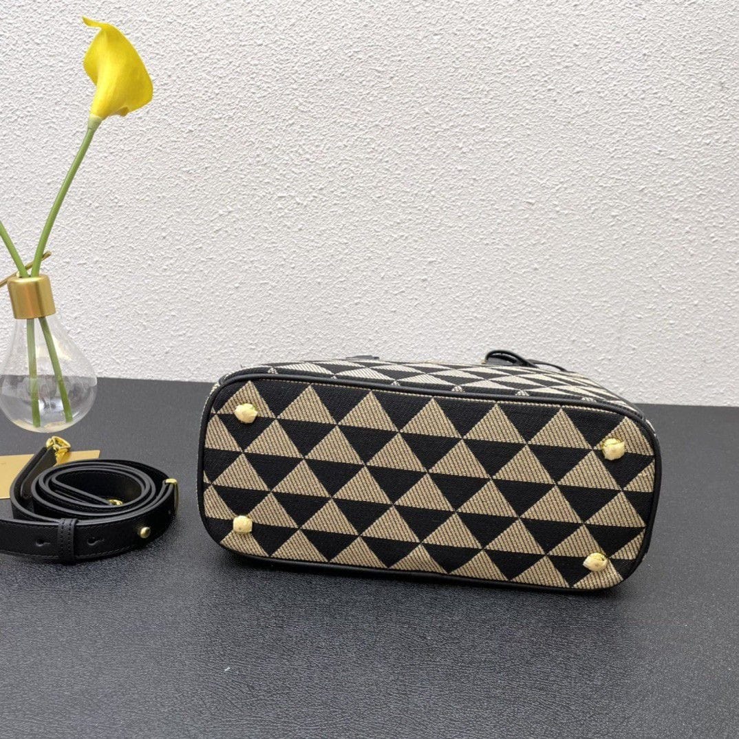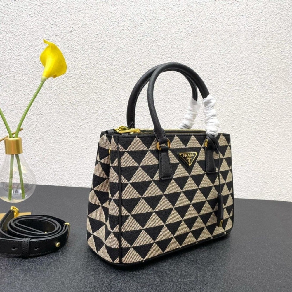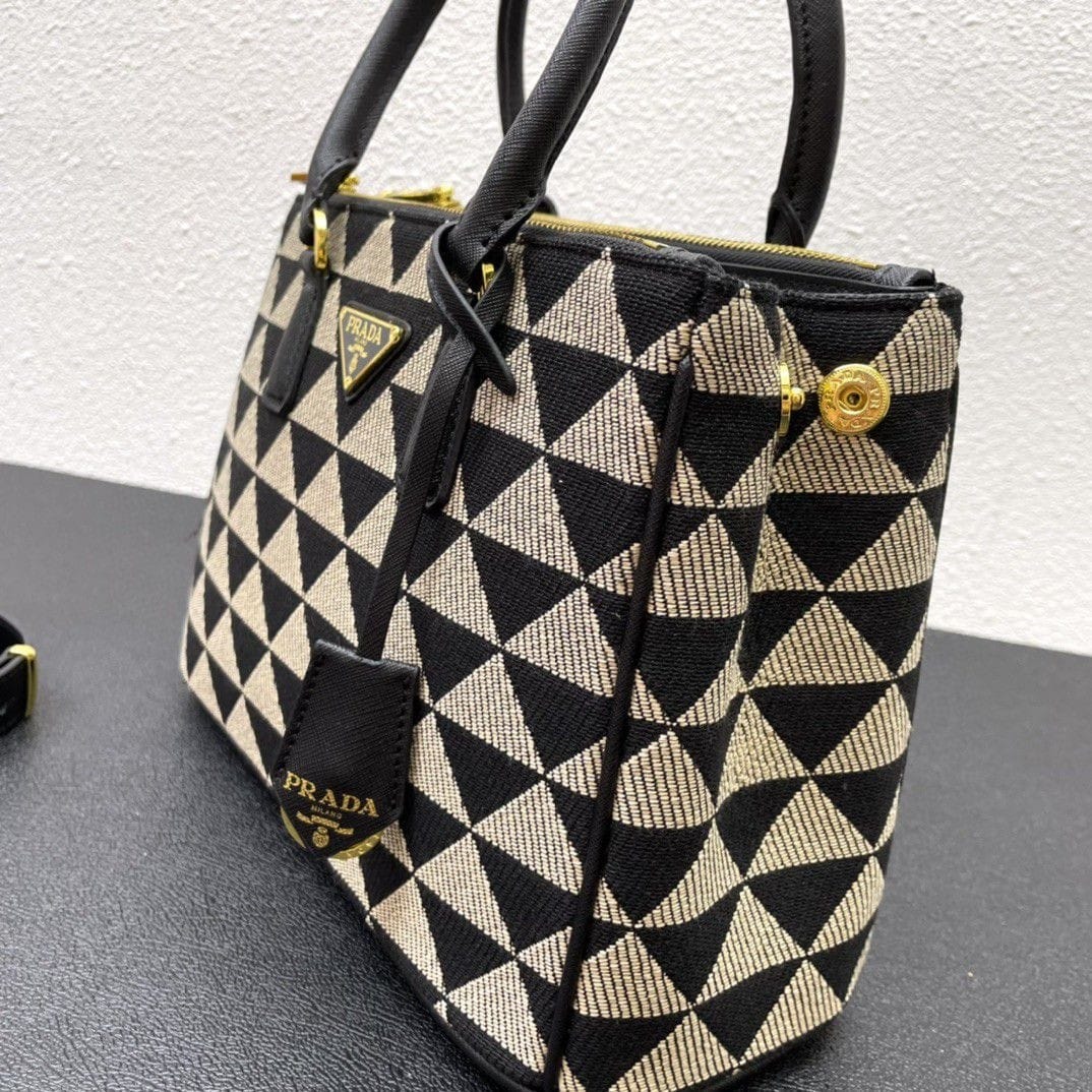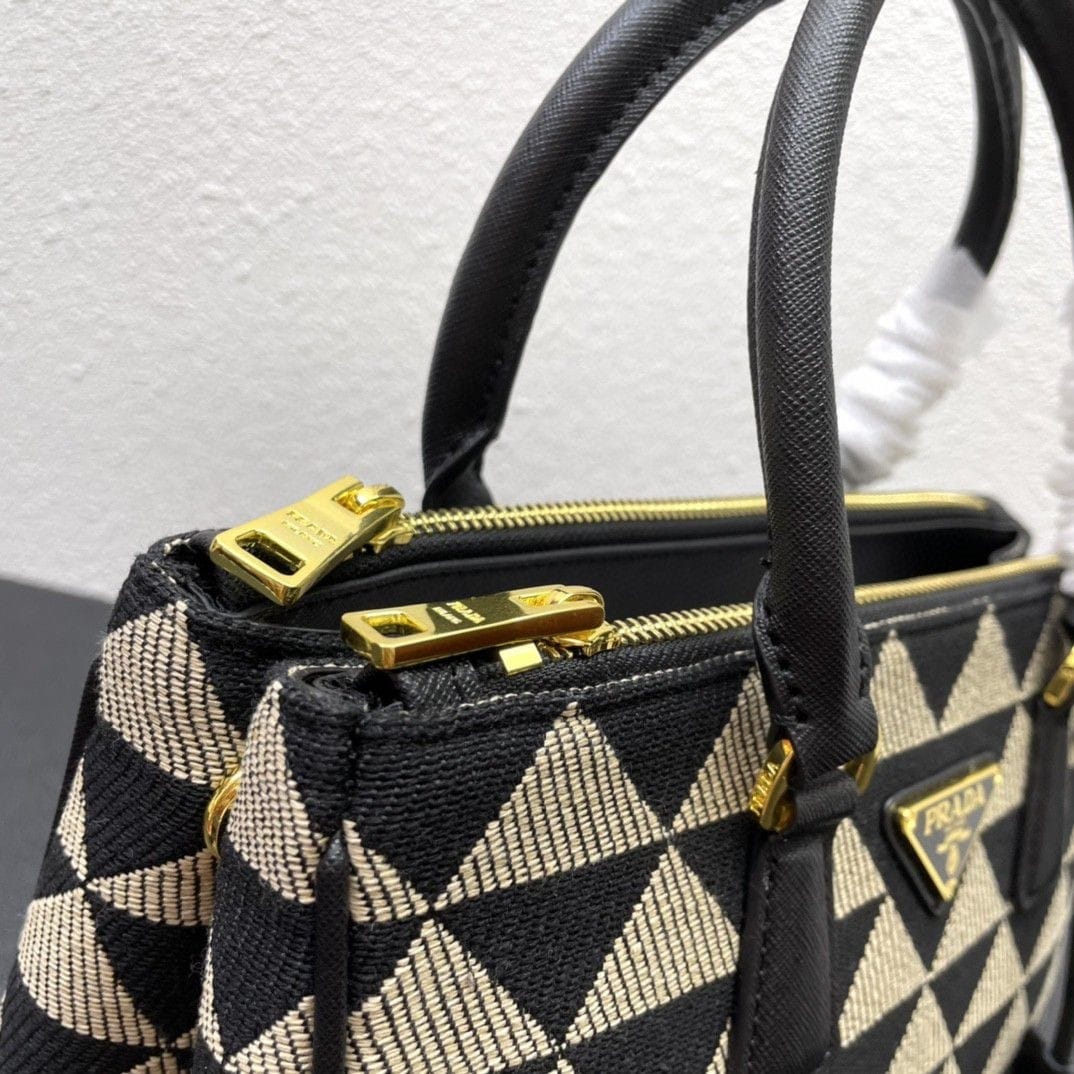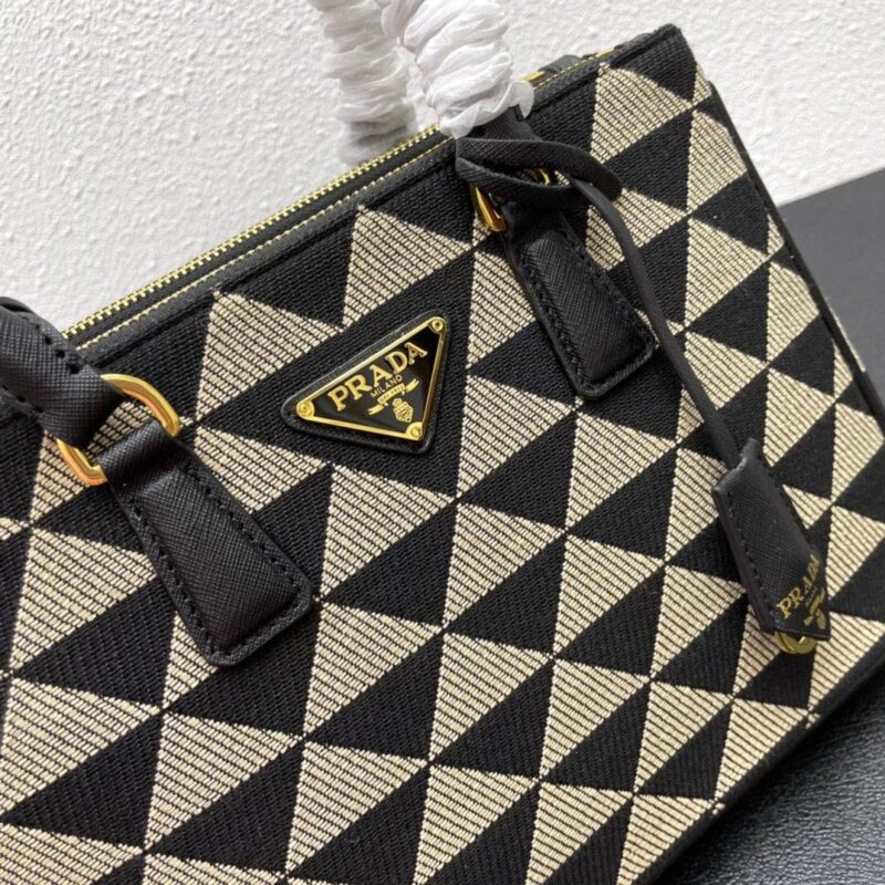 Prada Galleria Medium Symbole Embroidered Fabric Bag Black And Beige 1BA863 2FKL F0Y30 V OOO / 28 cm / 11 inches